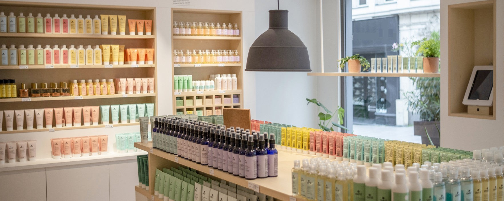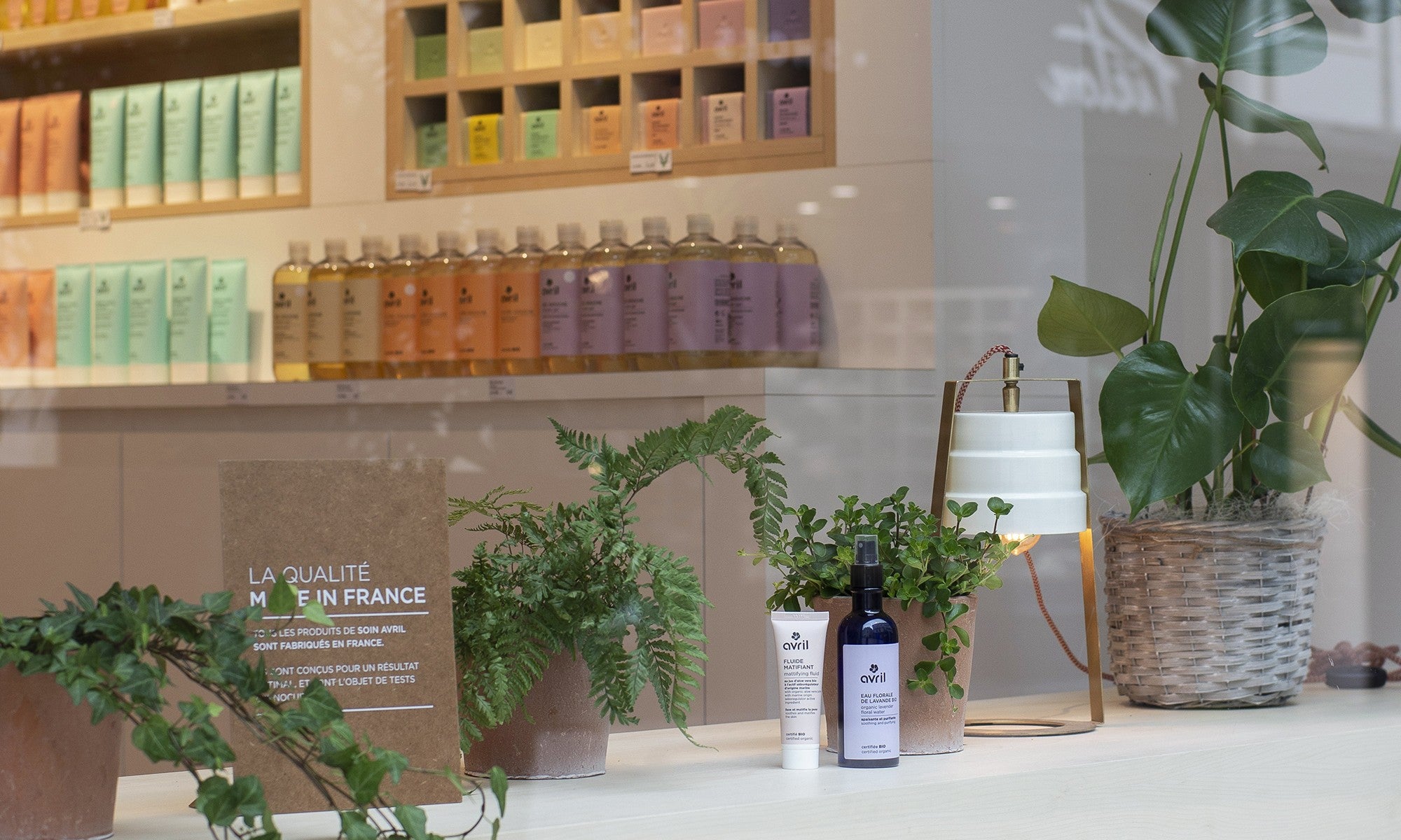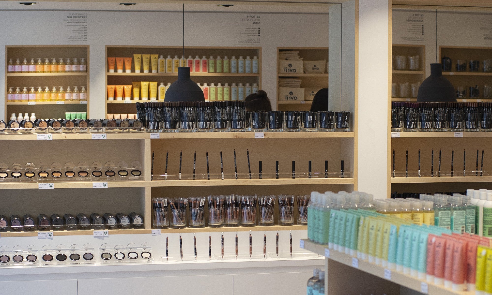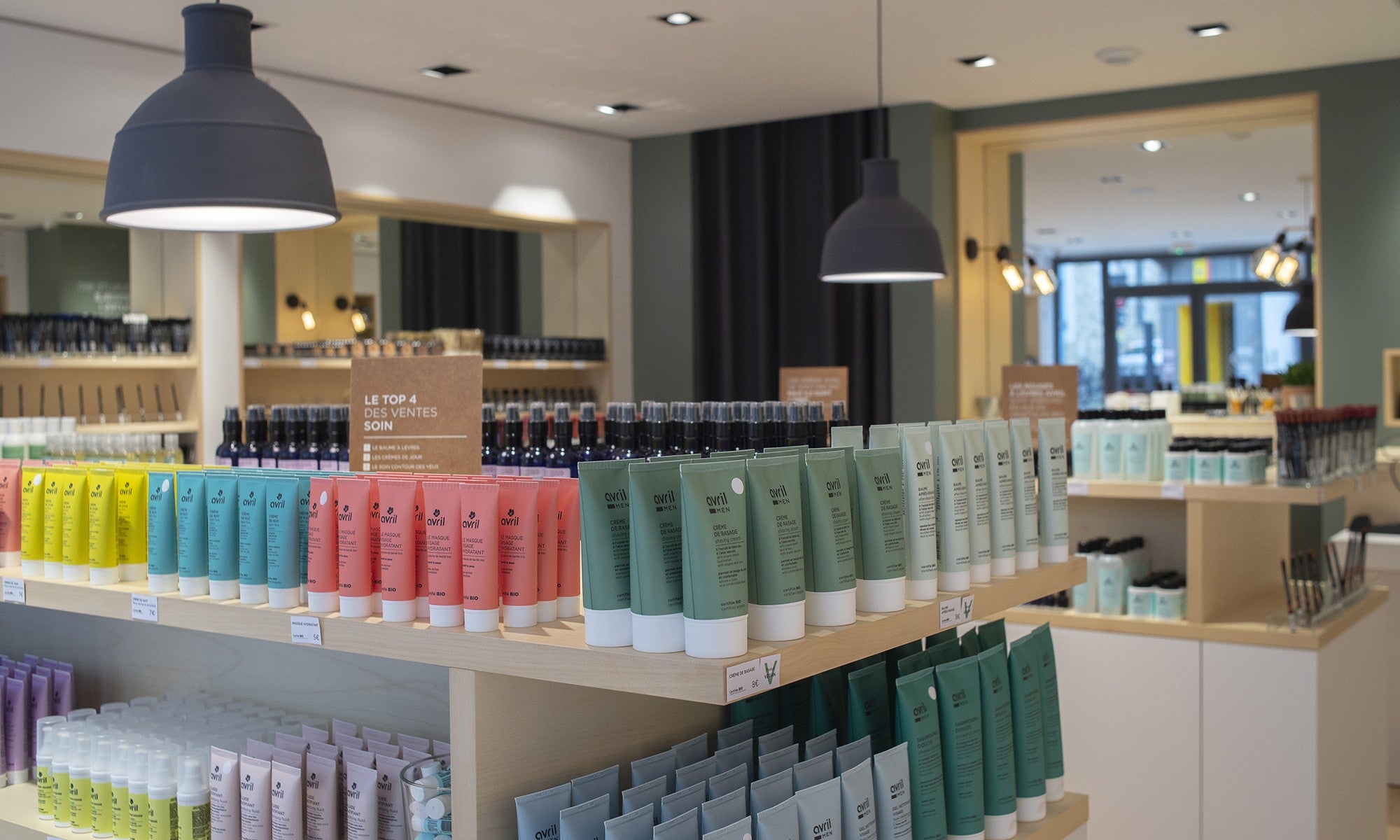 Pour la lumineuse boutique Avril située dans la jolie et piétonnière rue Lenepveu, le jeune architecte d’intérieur angevin Olivier Jourdain a imaginé un concept épuré et moderne, avec son parquet en bois clair, ses murs blancs et ses niches en érable verni. Les savons sont sagement rangés dans des alvéoles conçus à cet effet. Deux tables centrales également en érable mettent en valeur les produits de soins et les rouges à lèvres, éclairés par deux suspensions contemporaines en caoutchouc gris. En vitrine, une tablette suspendue à hauteur des yeux permet une présentation graphique des produits Avril pour attirer les passants. Au fond de la boutique, un bar à maquillage et ses tabourets blancs design invitent à se faire maquiller.