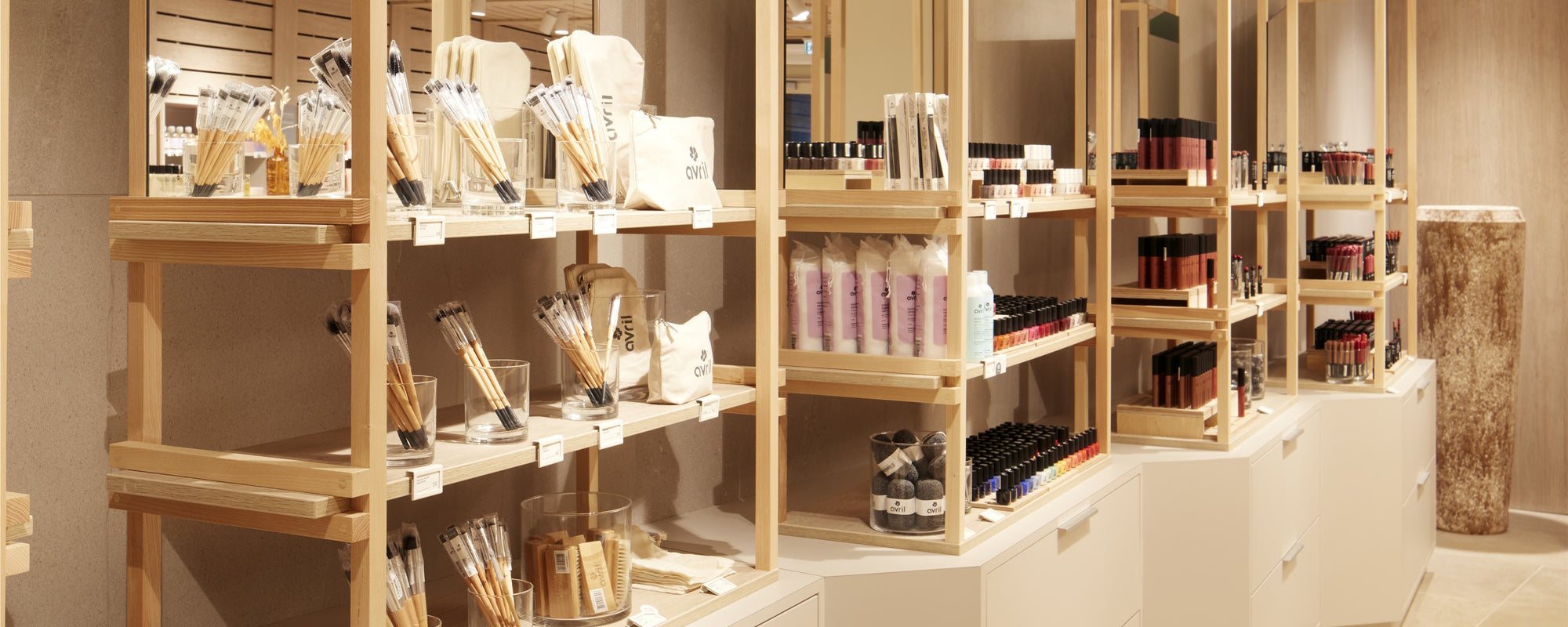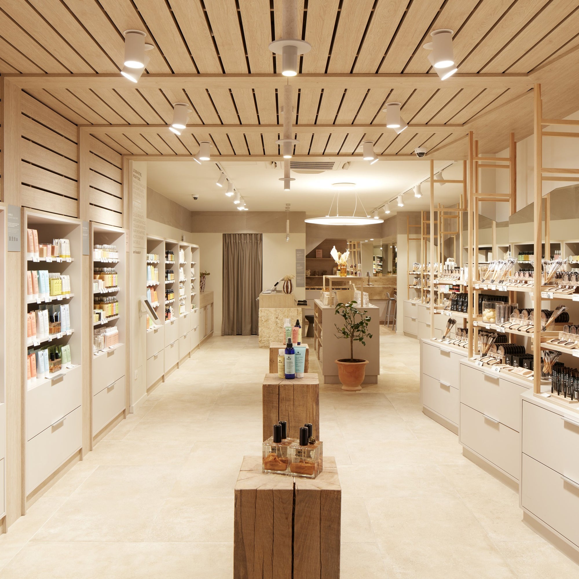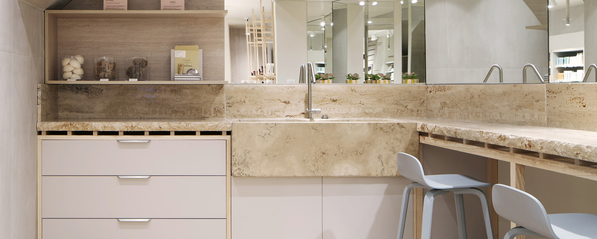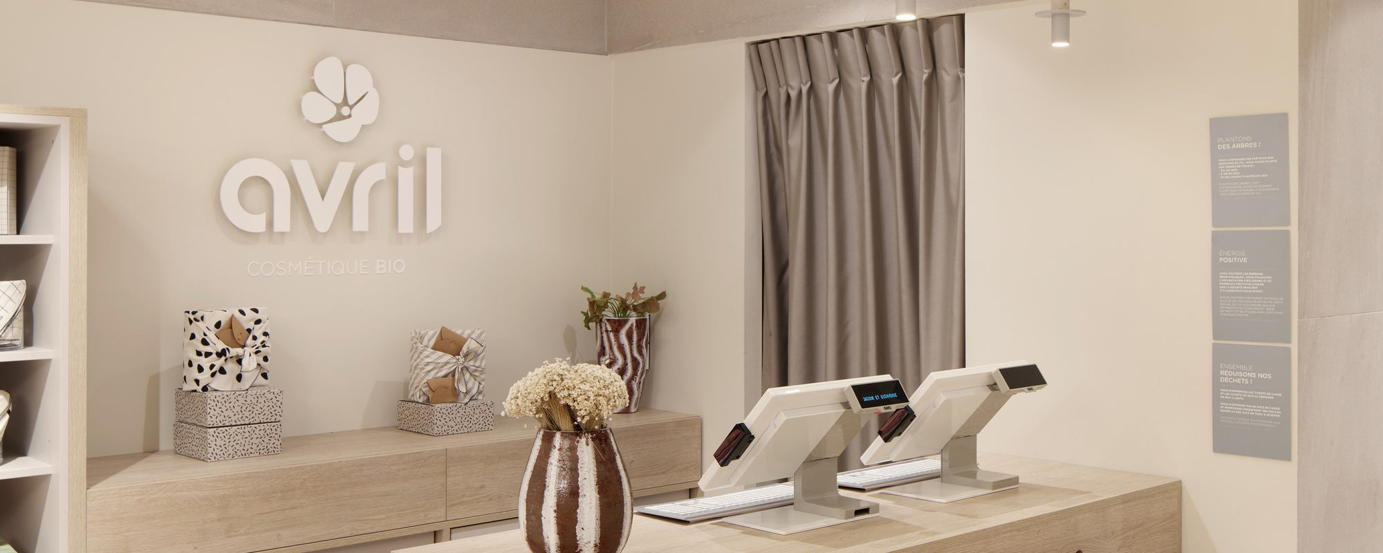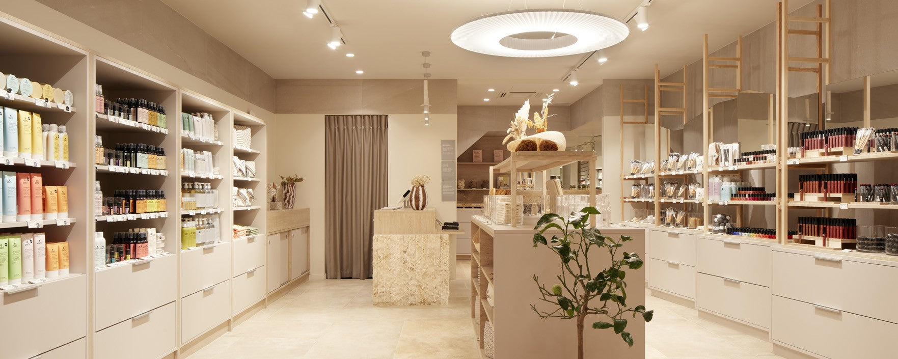 Pour la boutique Avril à Bayonne, le studio d’architecture Hekla s’est inspiré de l’univers thermal emblématique de la région. Tout en profondeur et située sous une halle marchande, elle est structurée en deux espaces distincts. Le premier, très chaleureux, évoque les Landes proches et reprend les codes du spa avec un habillage en lames de bois horizontales sur les murs et au plafond. Plus minéral, le second espace associe travertin et carrelage en faïence pour un rendu plus organique. Très présente, la pierre y est mise en valeur polie ou à l’état brut, créant ainsi un contraste visuel saisissant. Sur le côté droit de la boutique, les façades des meubles ont été travaillées de manière déconstruite, créant un jeu de rythme original avec le côté gauche très linéaire, et renforçant la perspective. La neutralité des teintes douces et des matériaux met parfaitement en valeur les jolies couleurs des produits.