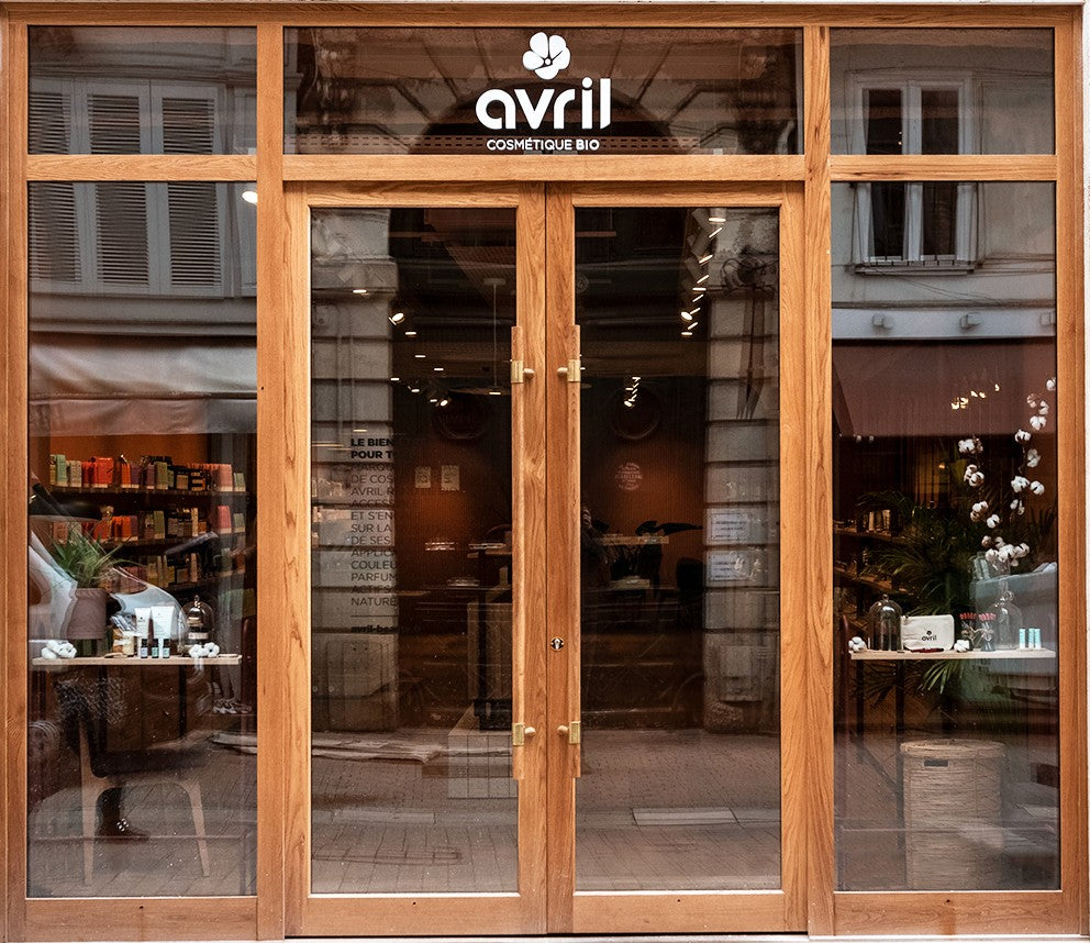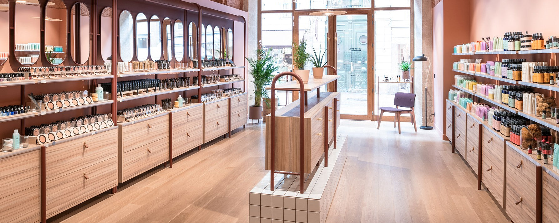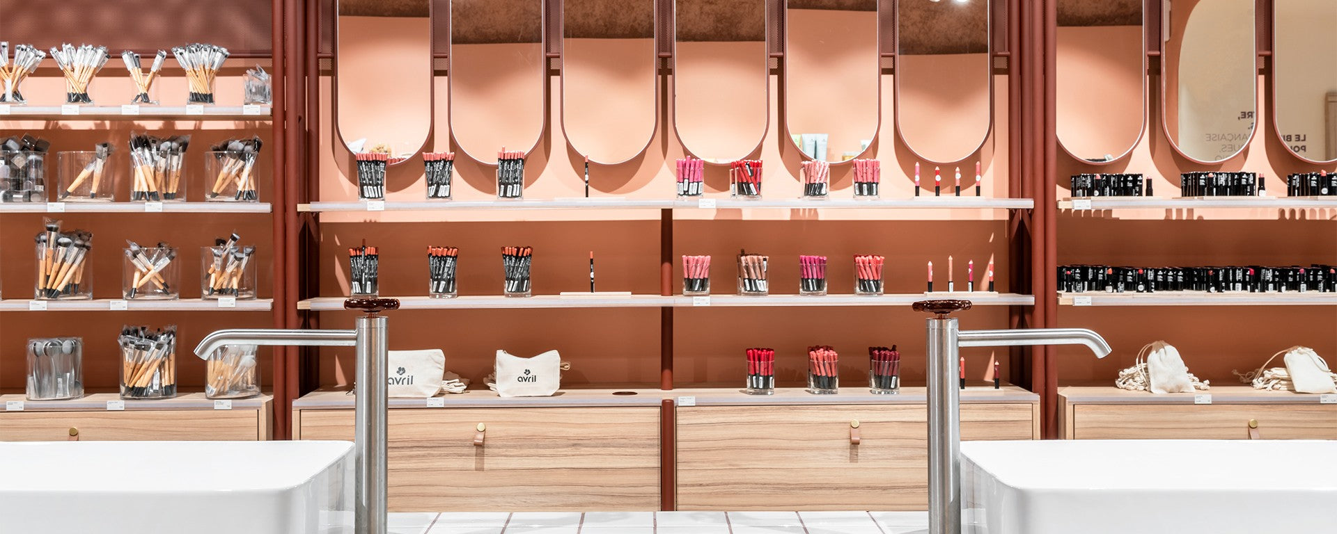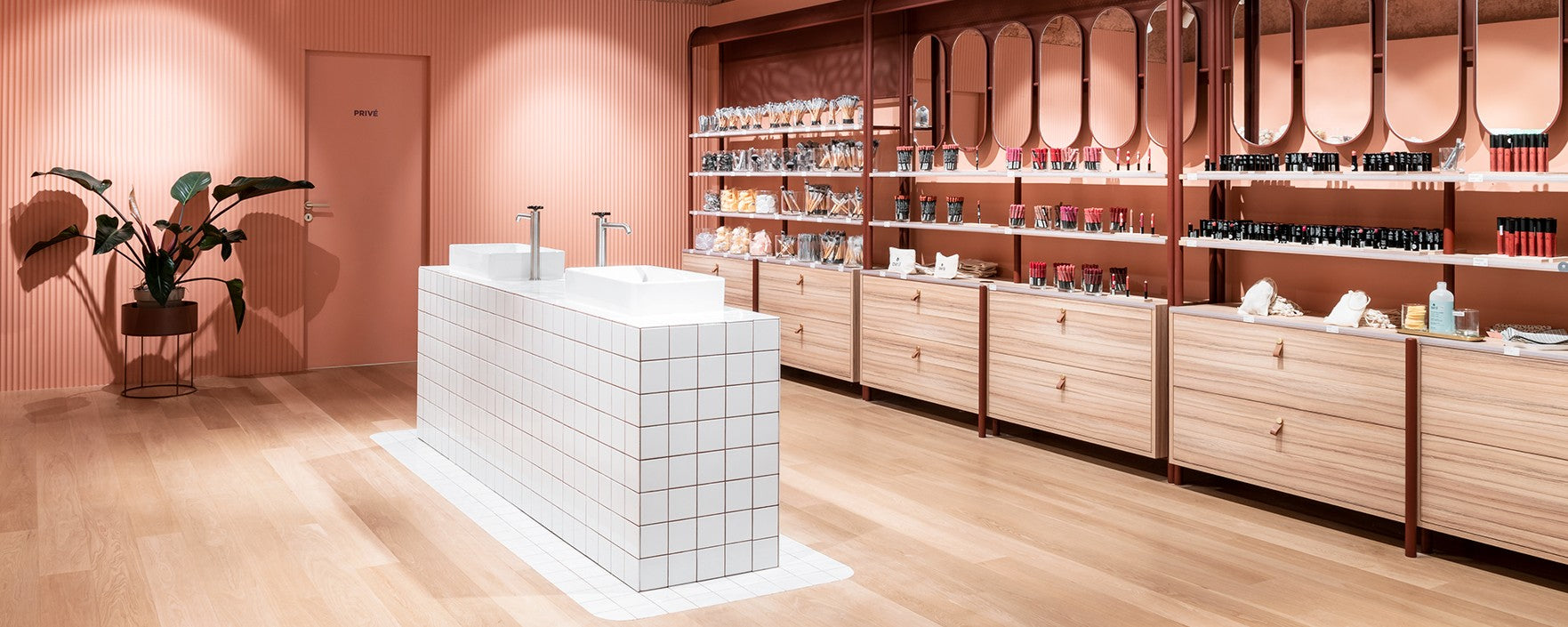 Dans la belle rue Porte Dijeaux bordée de maisons en pierre de taille typiques de Bordeaux, l’agence d’architecture d’intérieur Hekla a imaginé, pour cette grande boutique Avril, un concept inspiré des bains traditionnels. Des éléments de mobilier en carrelage blanc à joints rouge bordeaux rythment la longueur du magasin, et contrastent avec le parquet en chêne clair. Côté maquillage, des miroirs arrondis sont rigoureusement alignés au-dessus des produits. Les meubles plaqués en bois de cocobolo sont soutenus par des arceaux métalliques assortis au rose ocre des murs.
