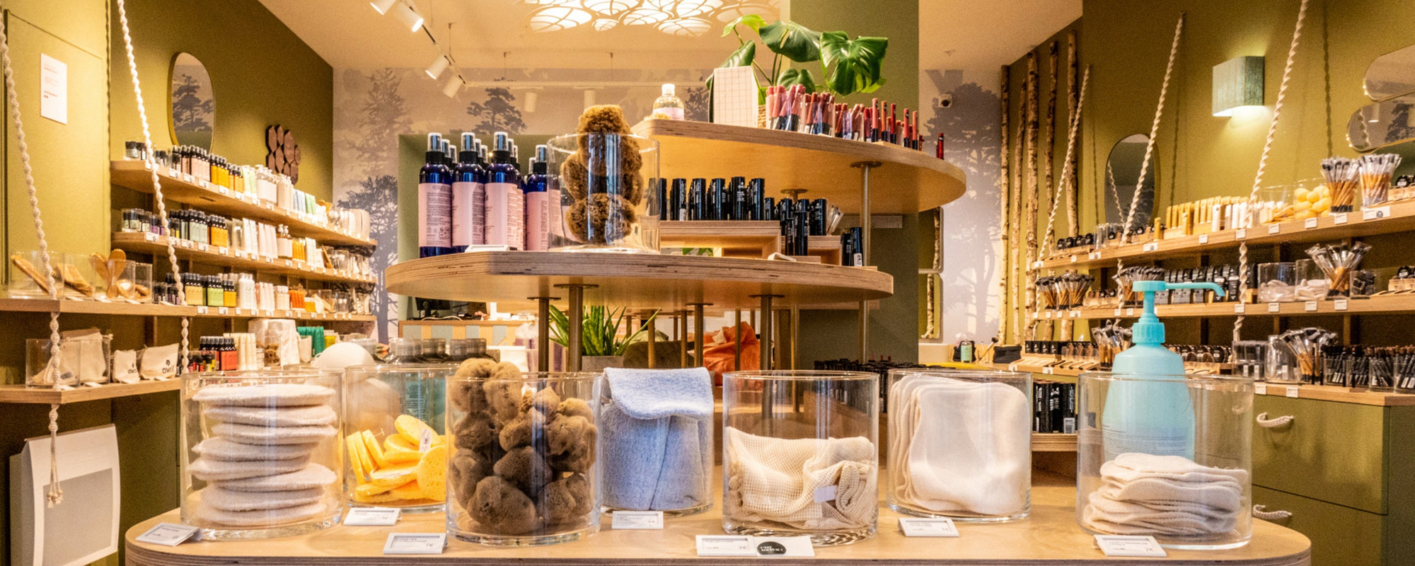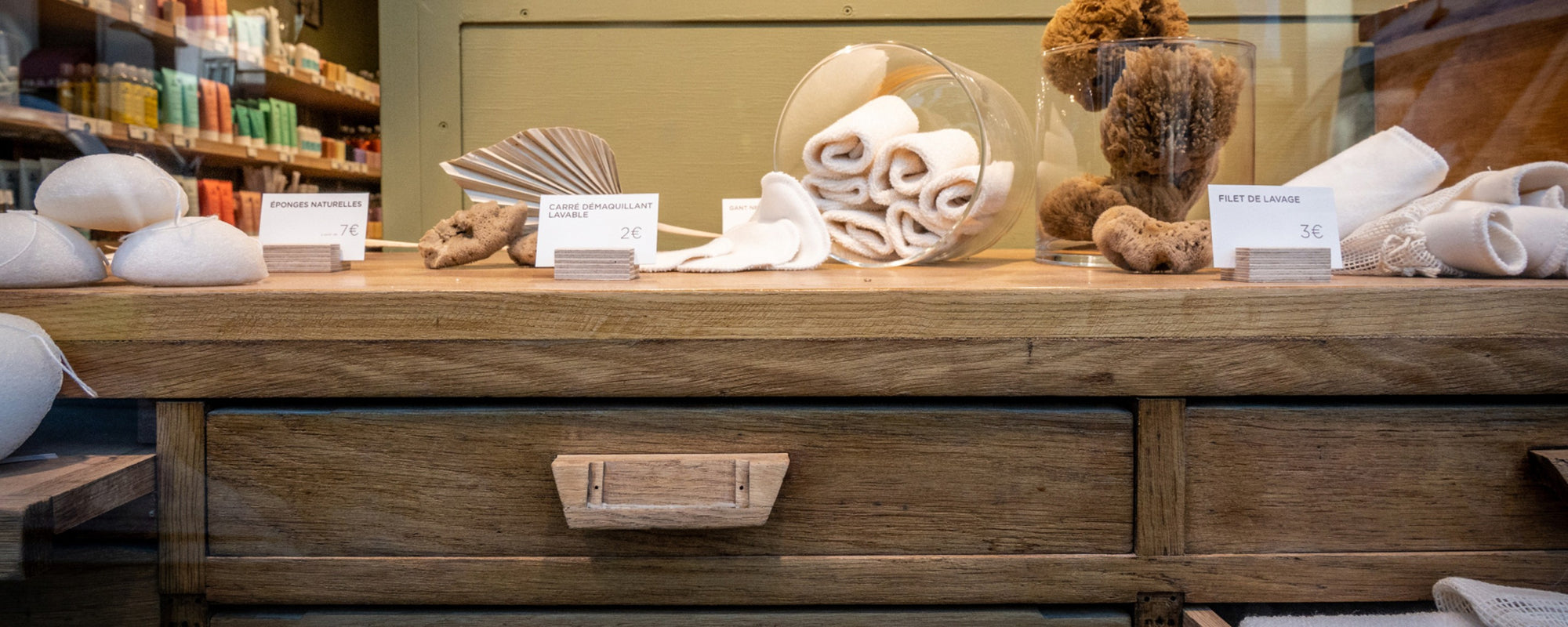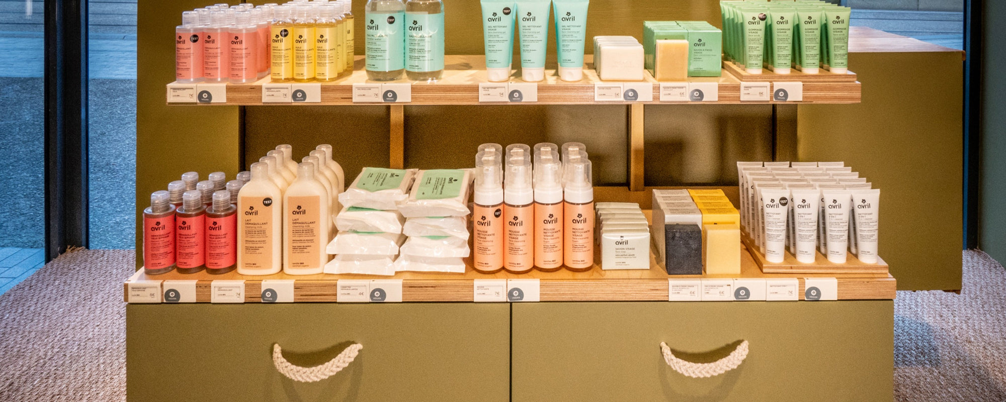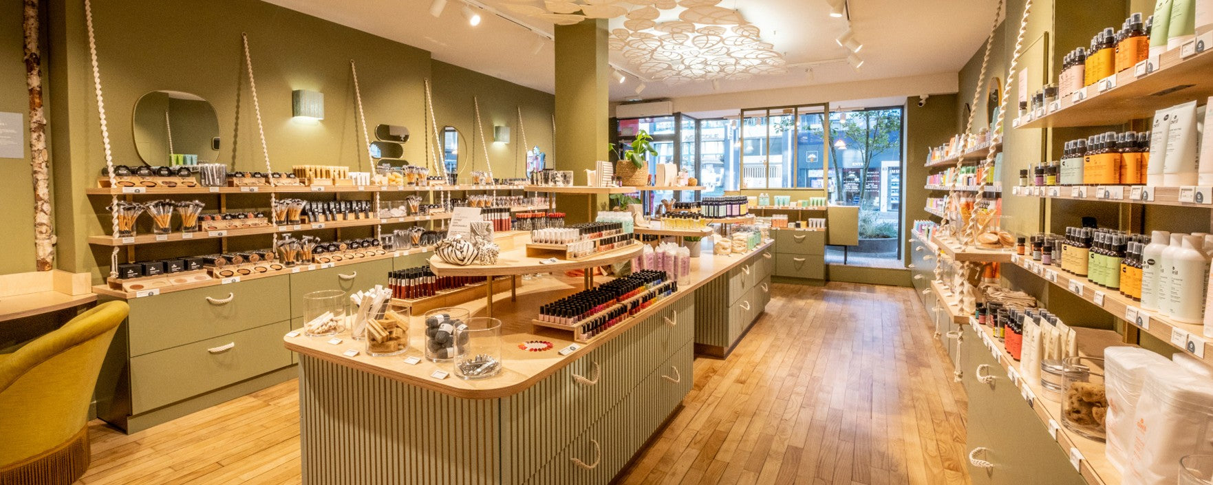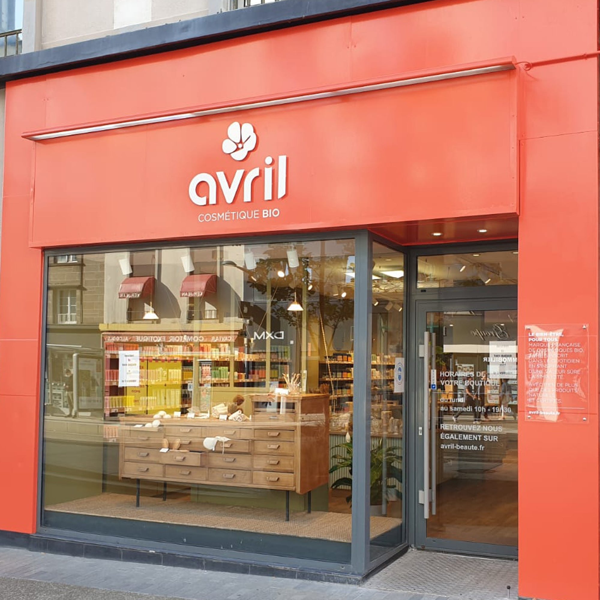 Dans la rue de Siam, artère principale de la ville de Brest, la boutique Avril surprend avec sa façade orangée, clin d’œil aux agrumes débarquant au port tout proche. En passant la porte, le visiteur est transporté dans un univers apaisant et végétal grâce à la douce teinte kaki, subtile évocation de l’histoire militaire de la ville. Dans une démarche écologique, des éléments de mobilier de la précédente boutique comme le meuble d’apothicaire et le lustre de la vitrine, la verrière ou les miroirs, ont été rachetés d’occasion afin de leur donner une seconde vie. Le parquet d’origine a également été conservé, et simplement poncé puis vitrifié. Suggérée dans le choix des couleurs, la nature est présente partout dans la boutique. Au plafond, une installation de feuilles stylisées et découpées au laser crée un joli jeu d’ombres sur le sol. Au fond, une fresque murale évoque la forêt et sur les murs, des troncs de bouleau coupés dans la longueur rythment l’espace. Les cordes des étagères et les poignées des meubles en macramé ont été fabriquées artisanalement à St Malo avec des fibres françaises bio.
