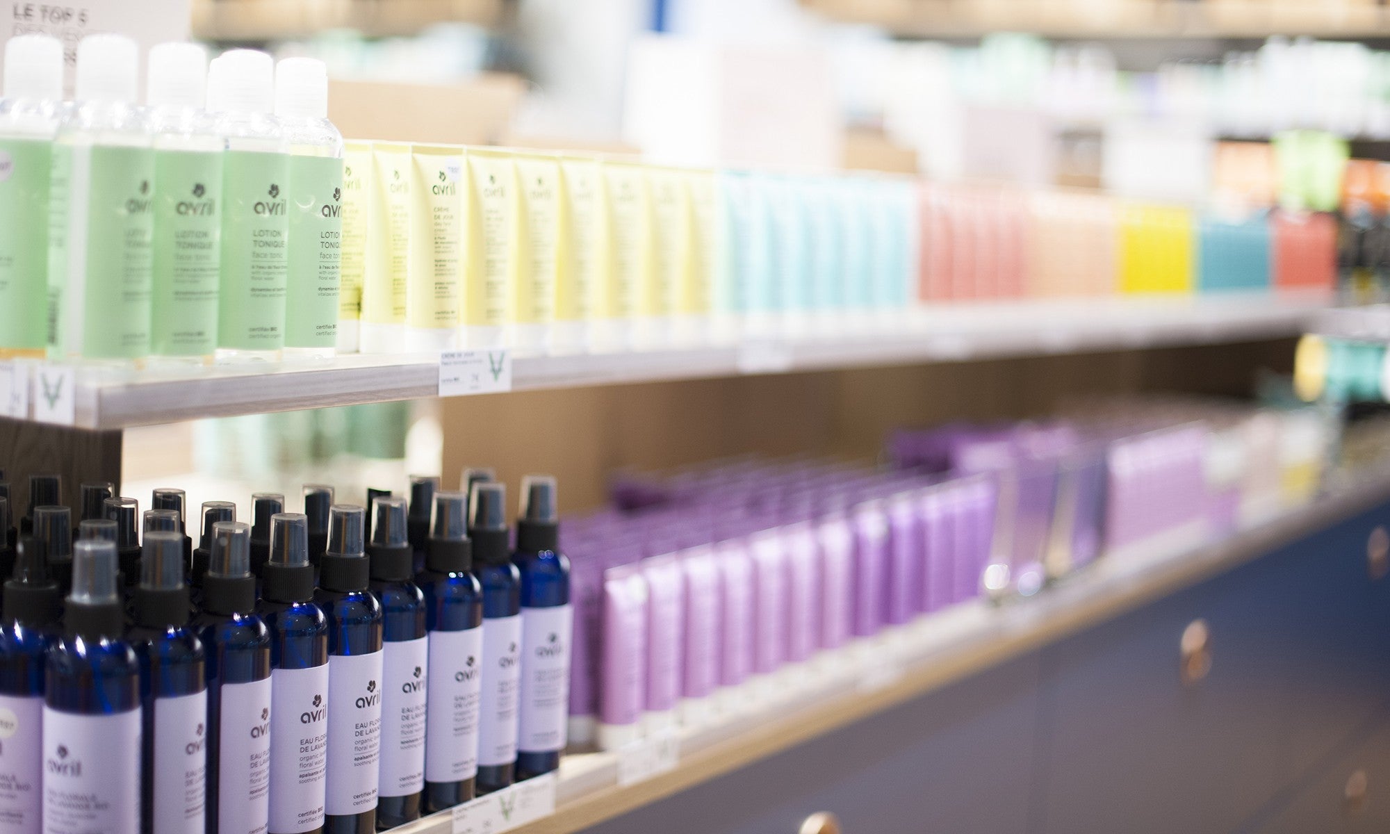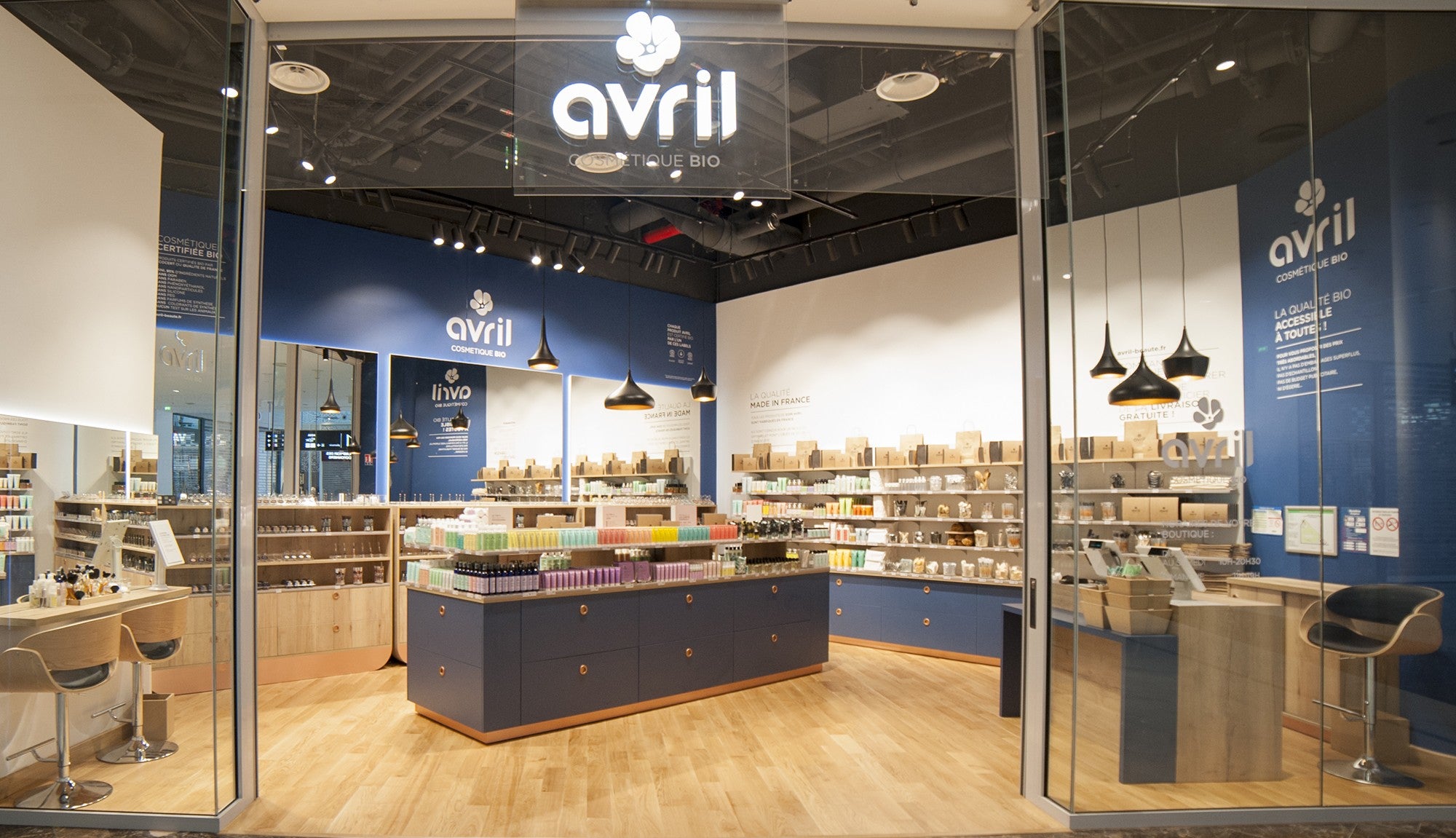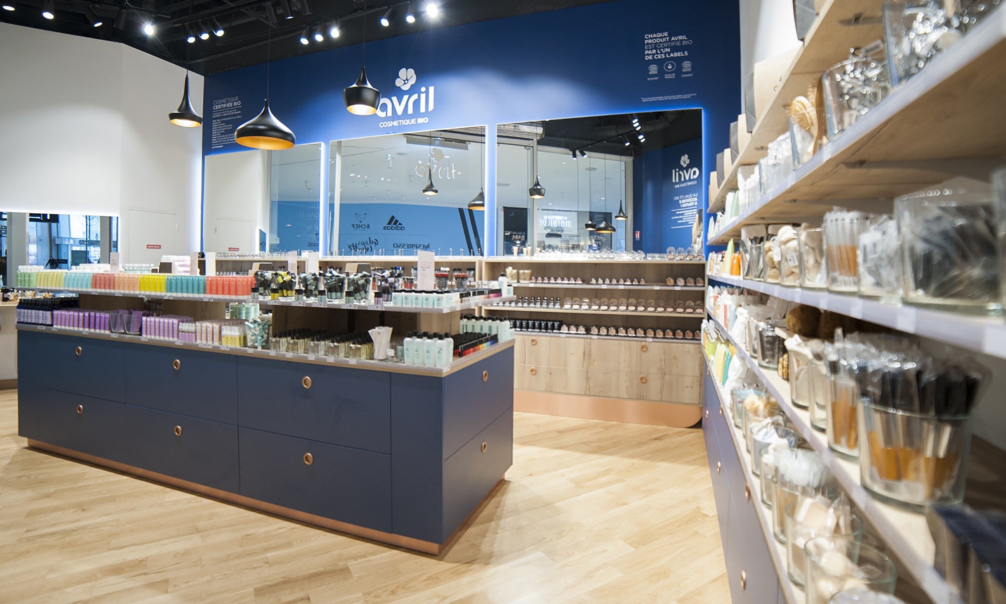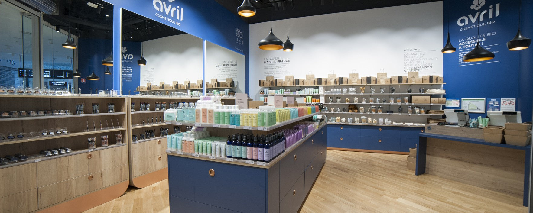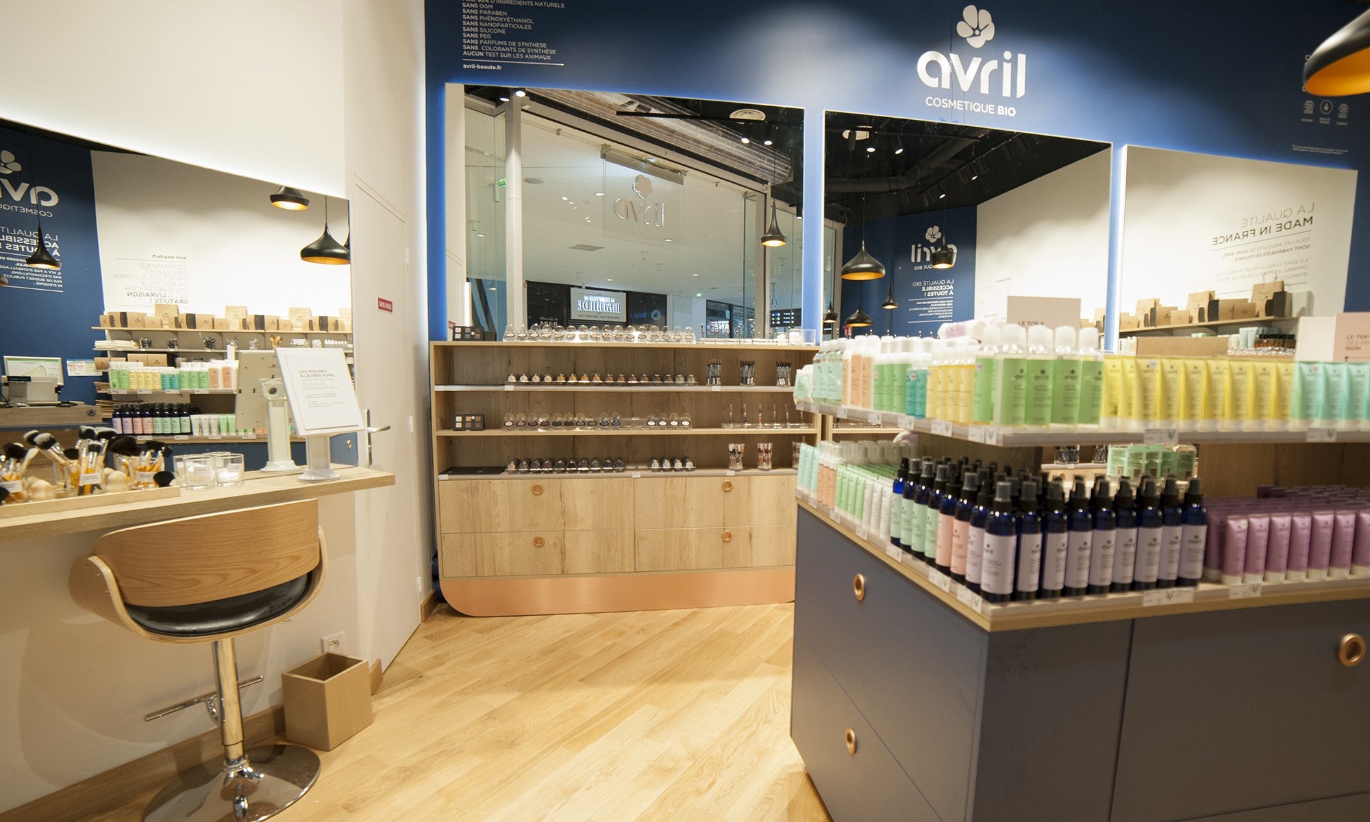 La galerie commerciale rénovée de Carré Sénart abrite une jolie boutique Avril, bien visible avec sa large façade vitrée, et son concept… bleu, voulu par la jeune architecte Amélie Truchet, voisine du centre. 3 « cabinets de maquillage », avec leur base en laiton aux angles arrondis façon art déco, posés sur le parquet, et surmontés d’un grand miroir, accueillent les produits. Des suspensions contemporaines éclairent le meuble central et la caisse.