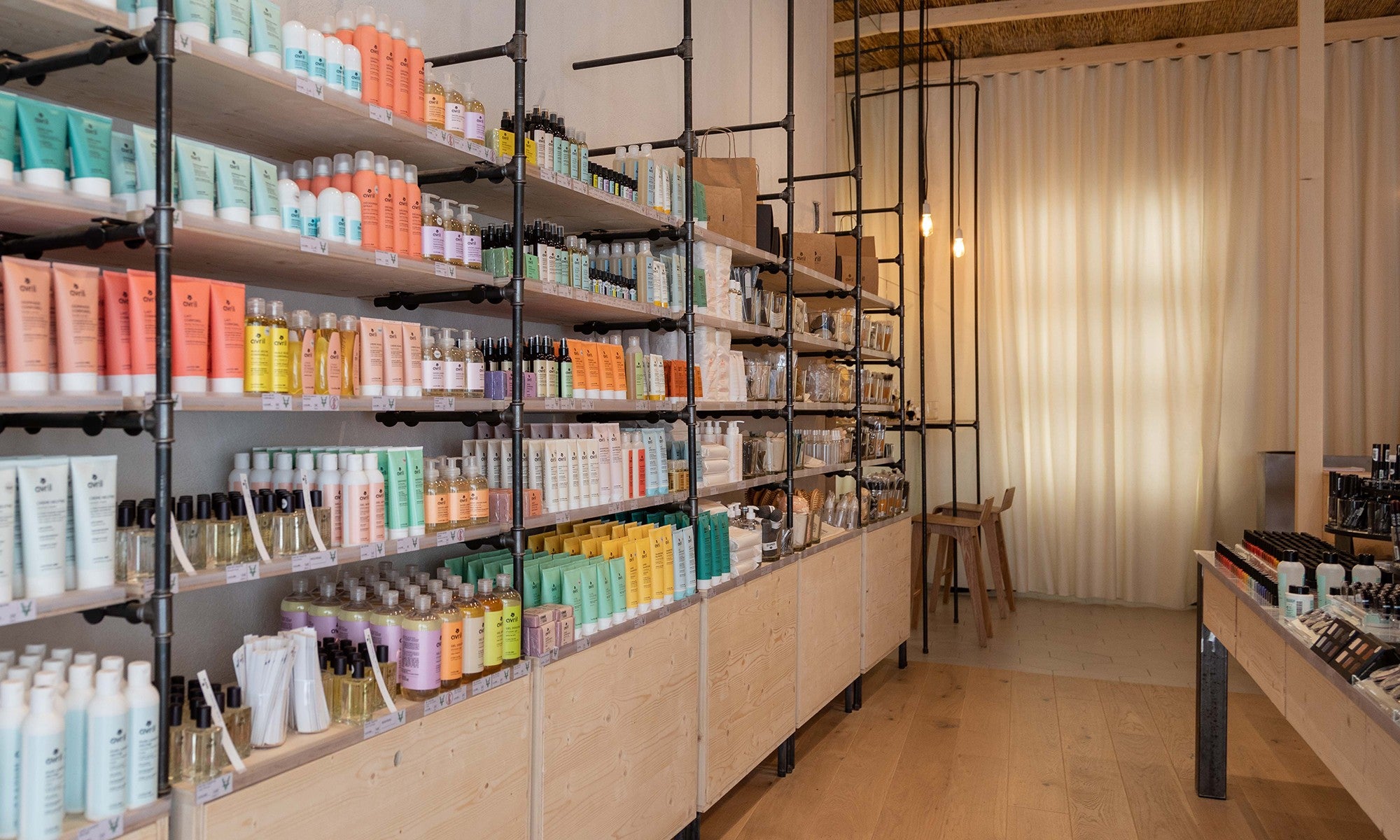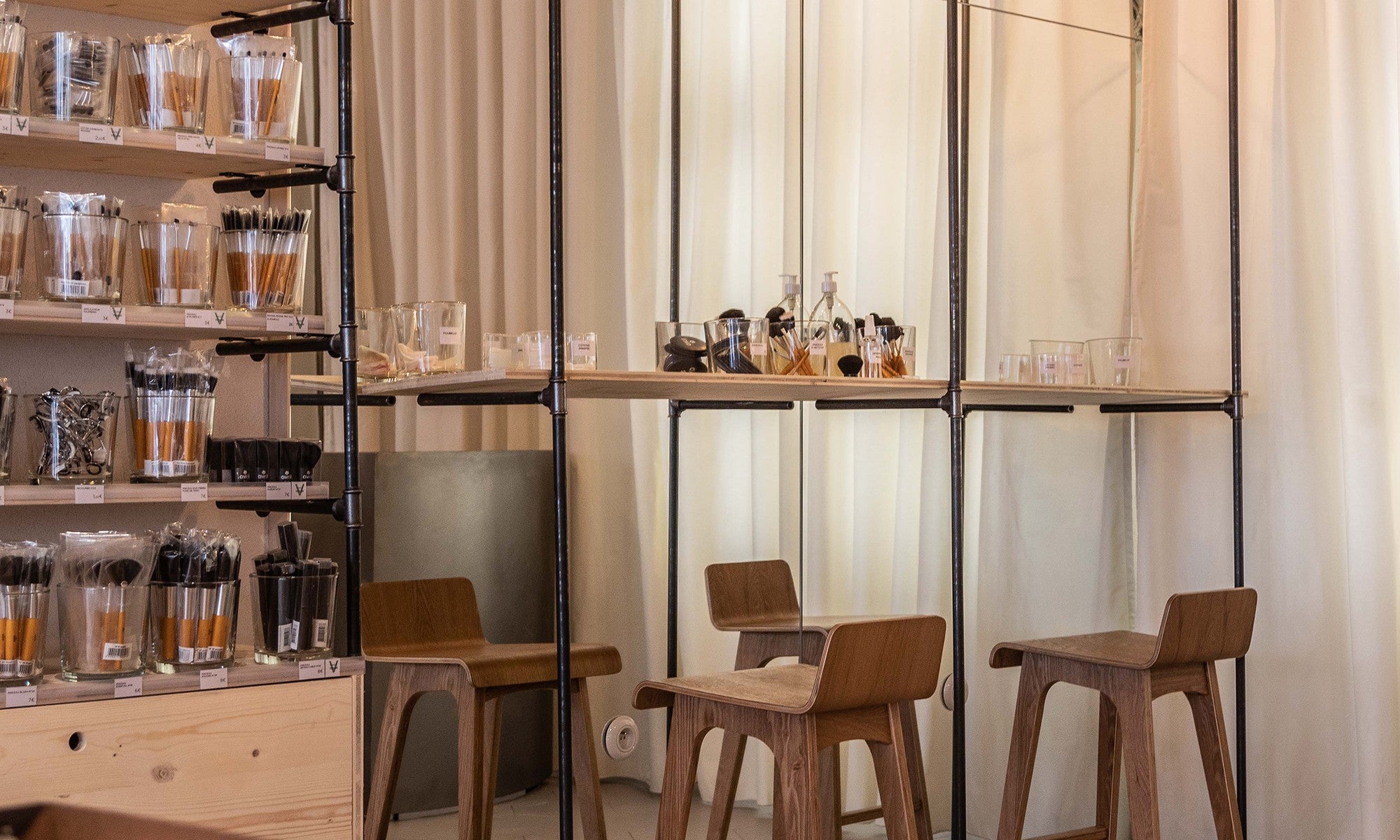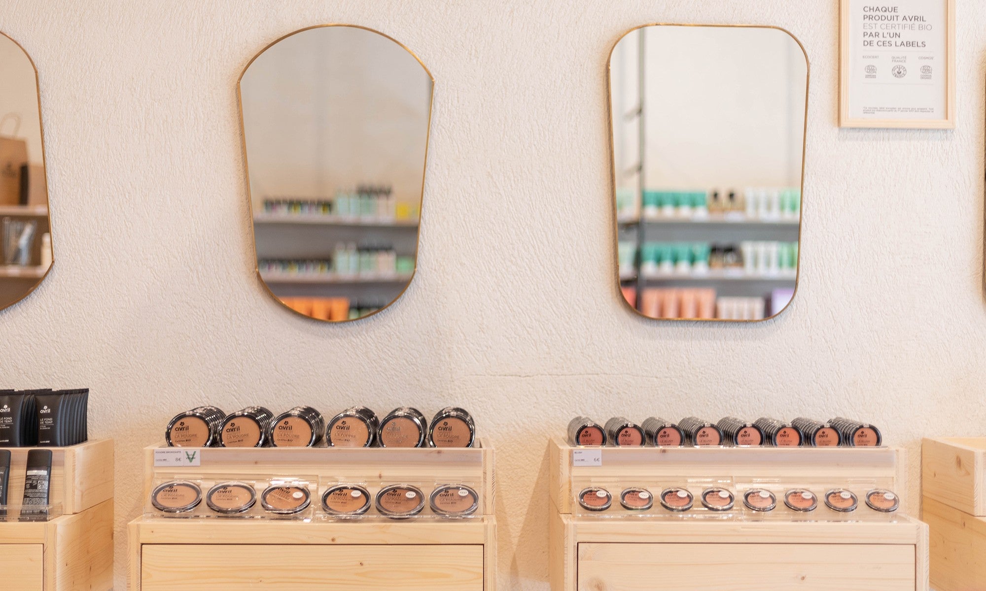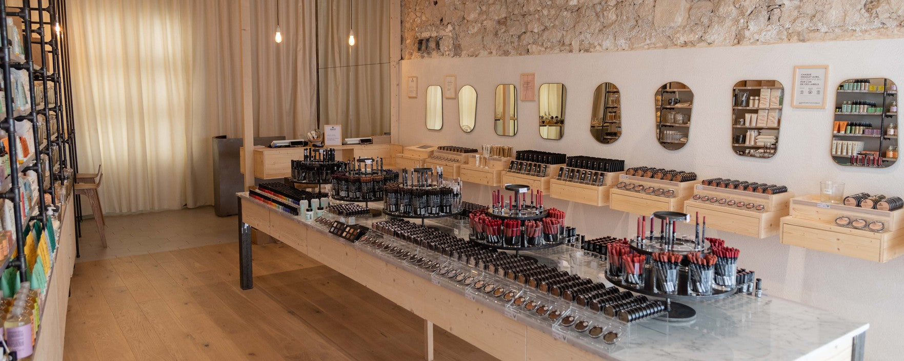 Dans la belle rue Saint Ferréol, le mur de pierres provençales et le plafond de bois d’origine ont été redécouverts pendant les travaux de la boutique Avril. La longue table centrale et son plateau de marbre, sur lequel sont posés d’étonnants présentoirs à gâteaux, accueillent le maquillage, ainsi que des consoles fixées sur le mur et surmontés de miroirs de formes diverses. Sur l’autre mur, des montants métalliques de style industriel soutiennent les étagères qui présentent les produits de soin. Le bar à maquillage se niche sous les canisses et devant le rideau lumineux qui met en valeur le fond du magasin.