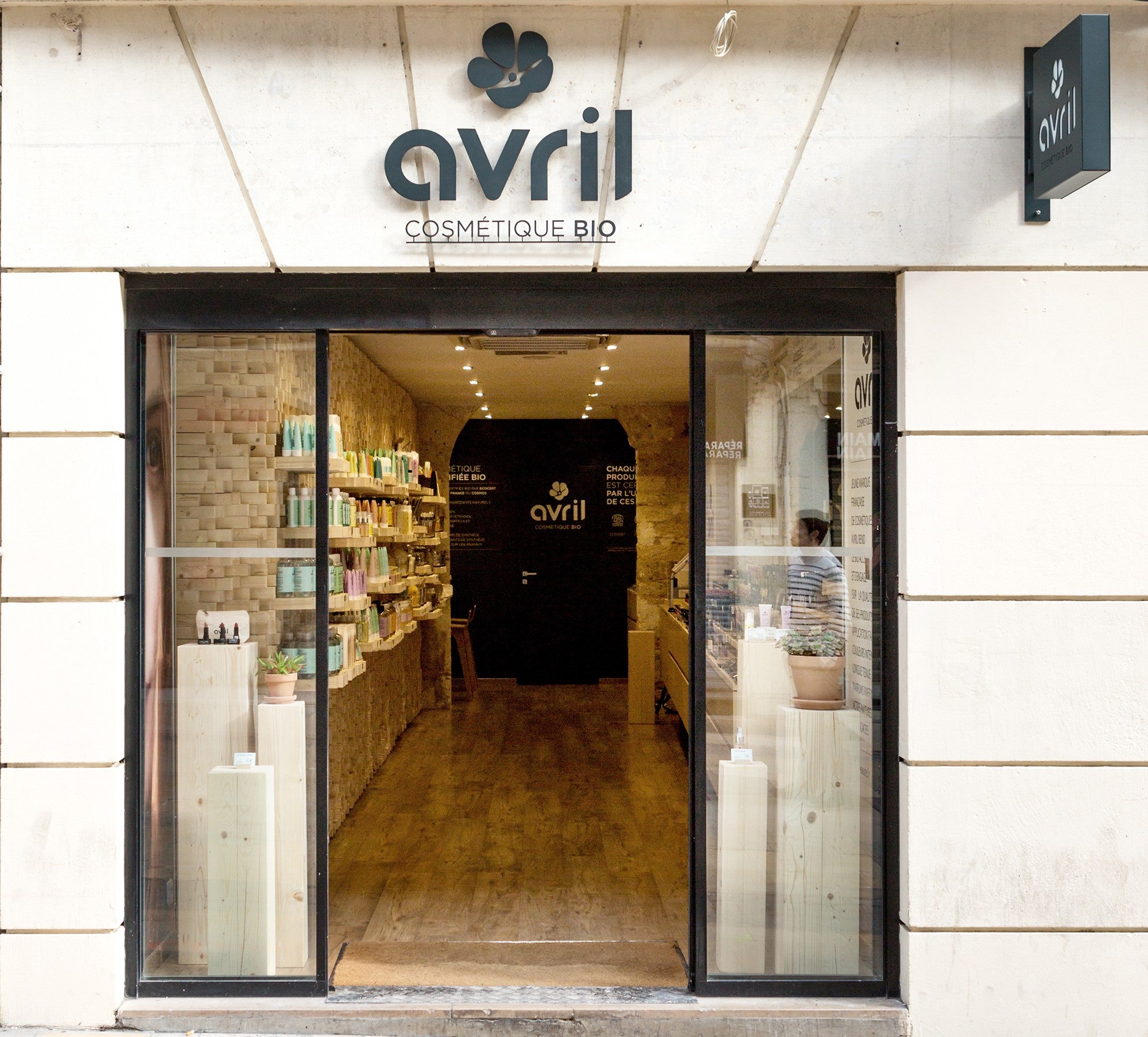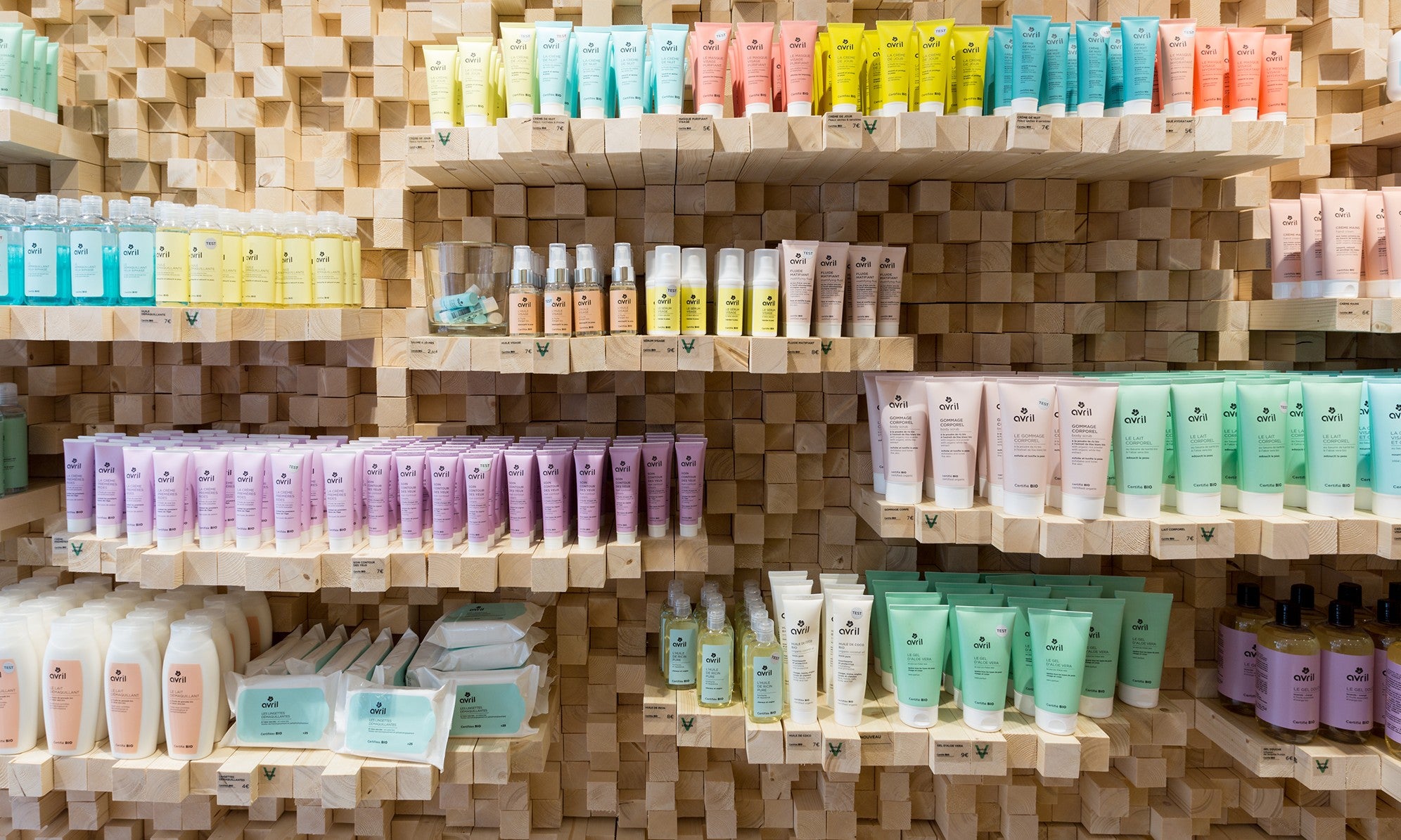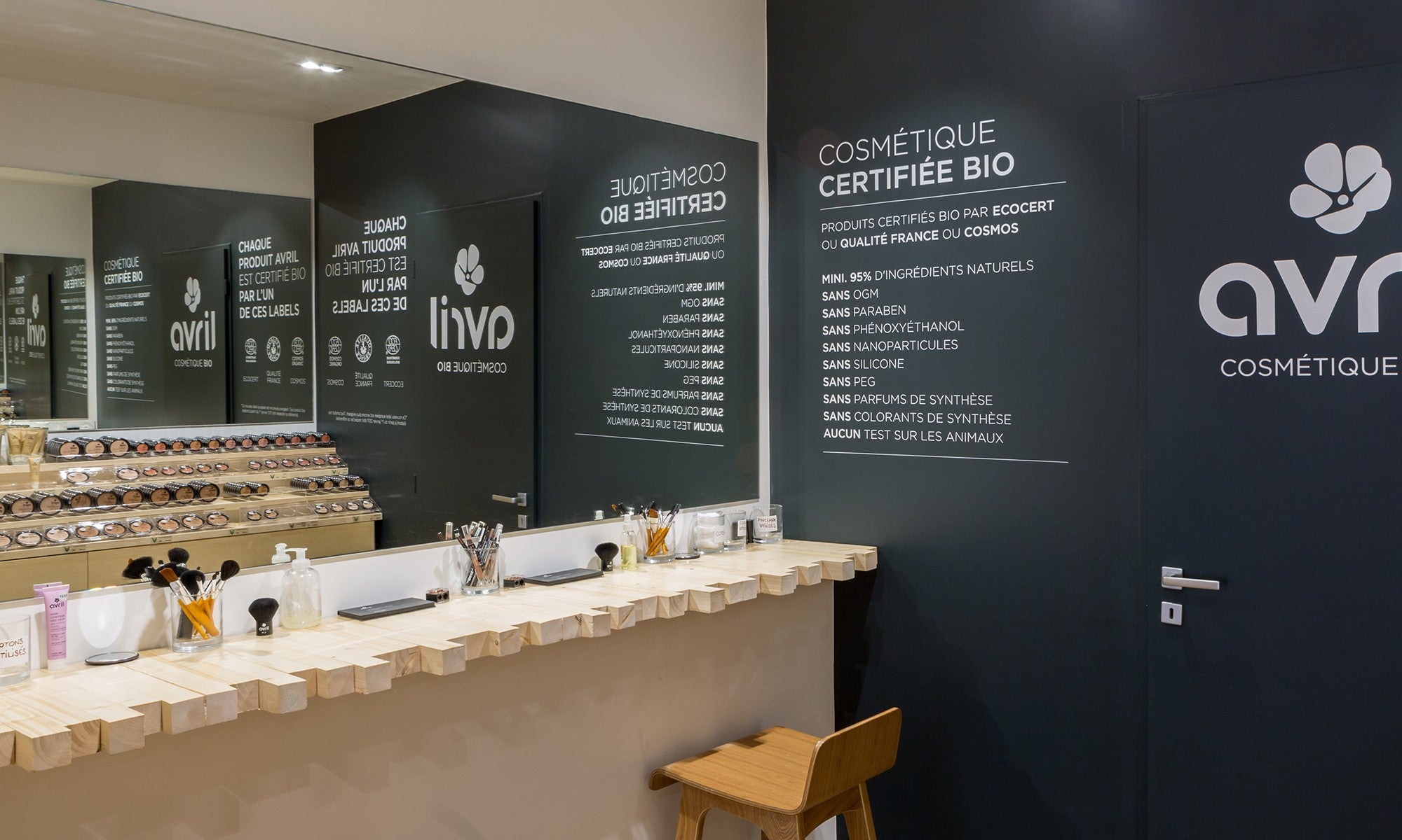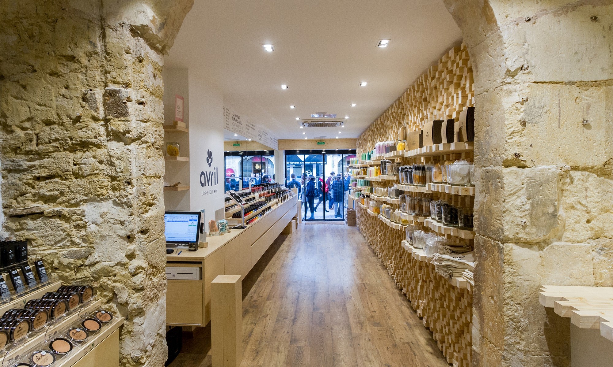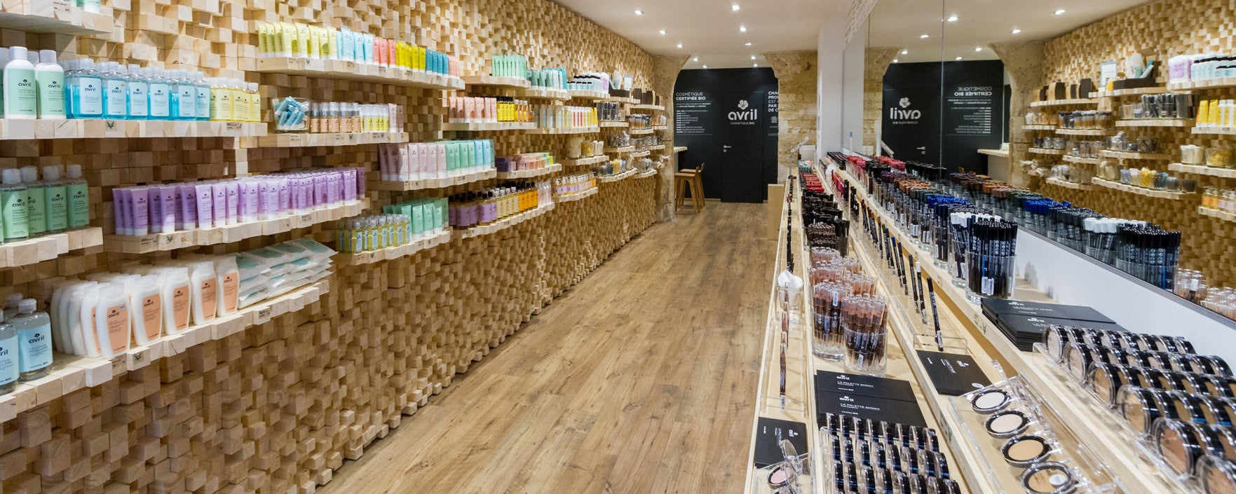 La jeune équipe montpelliéraine d’ONA Architecture a conçu un incroyable « mur graphique » de tasseaux de bois irréguliers aux nervures visibles, pour mettre en valeur et présenter, sur des étagères également constituées de tasseaux, les produits de soin Avril, sur le côté gauche de cette boutique étroite, située dans le centre historique de la ville. Par contraste, le côté droit, consacré au maquillage, s’élance en finesse avec de grands miroirs donnant de l’ampleur à la boutique, tout en assimilant le relief du mur opposé. Au fond, un mur gris anthracite met en valeur l’arche en pierre d’origine, qui ouvre sur le bar à maquillage.