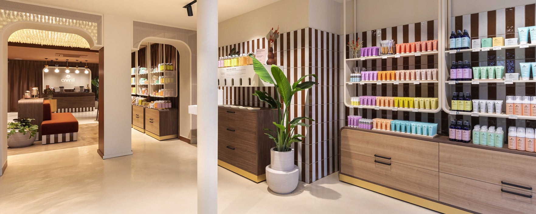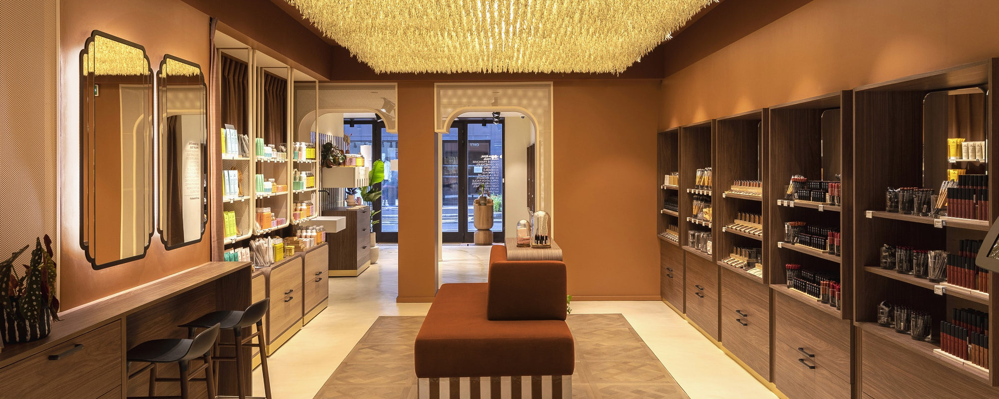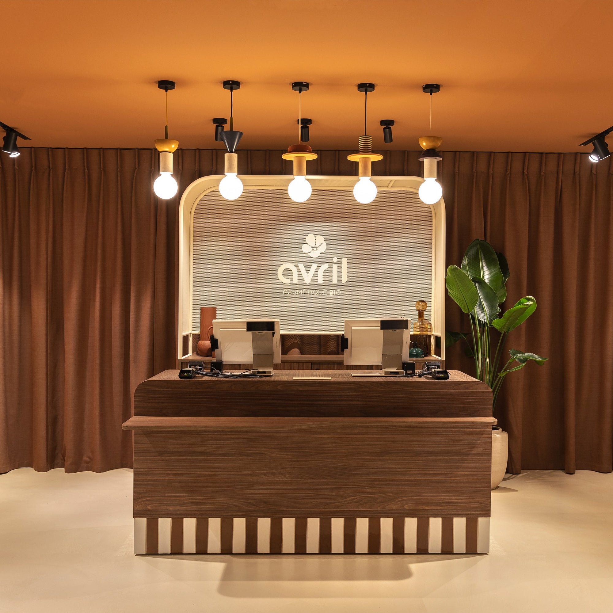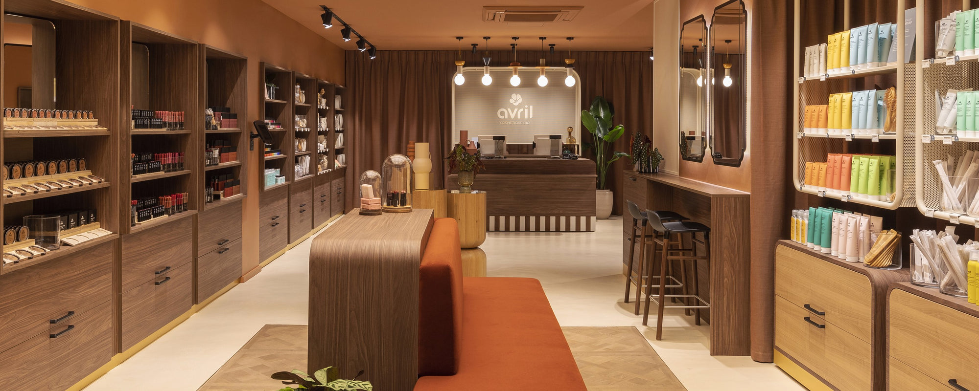 C’est sur la très animée rue du Commerce dans le 15ème arrondissement de Paris que le studio d’architecture Hekla signe sa deuxième boutique pour Avril. Poussez la porte et plongez dans son univers apaisant, qui offre une véritable déconnexion avec l’environnement urbain du quartier. Toute en longueur, la boutique présente deux espaces aux ambiances différentes, comme une invitation progressive au voyage. La première partie, très lumineuse, évoque le monde thermal avec sa faïence bicolore et sa jolie vasque. On progresse ensuite vers un espace plus intime, aux couleurs chaudes et à l’esprit boudoir. Une banquette en velours permet de s’asseoir un moment sous le plafond végétal de blé éclairé. Le parquet Versailles en chêne et les façades des meubles en noyer foncé apportent une touche d’authenticité à cette boutique très intimiste et chaleureuse.
