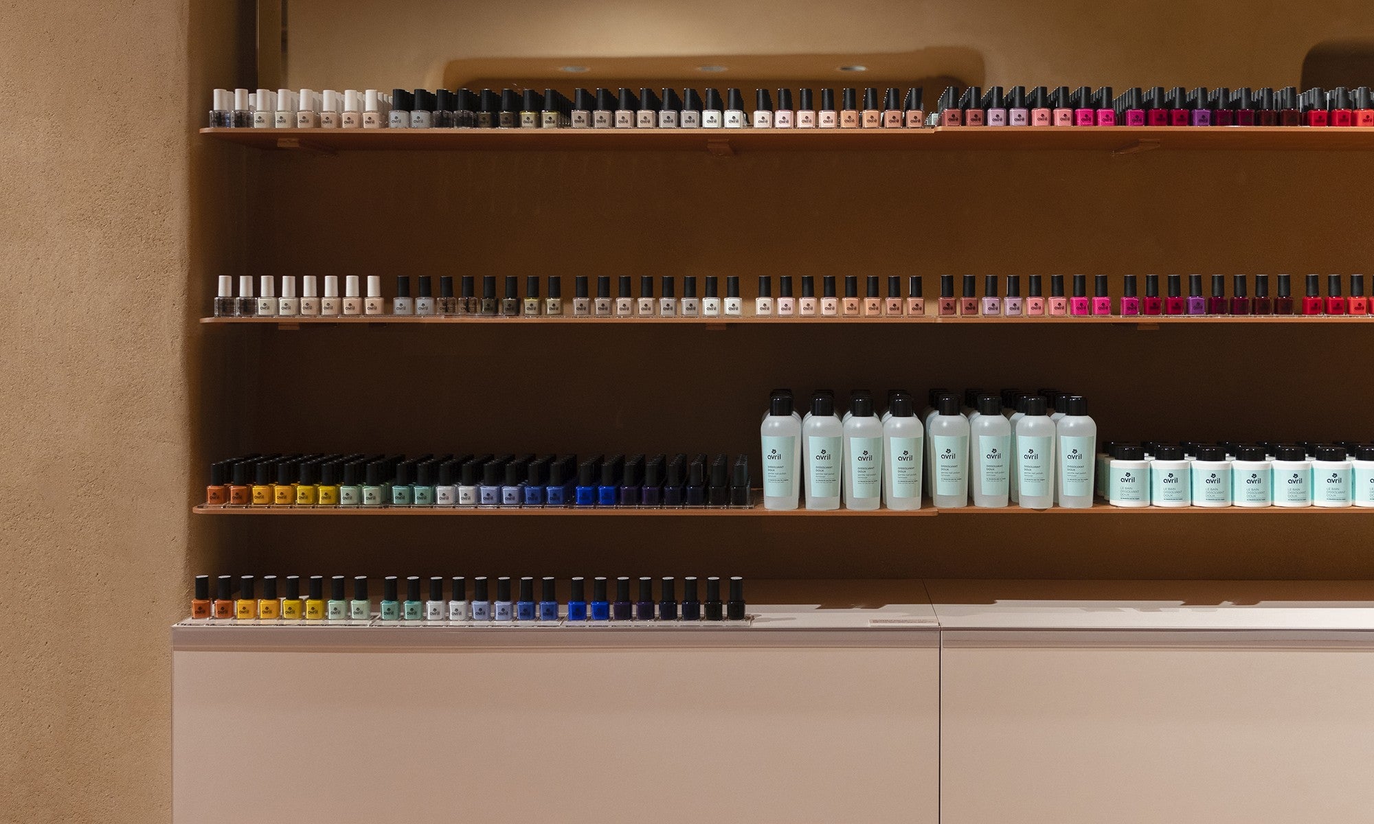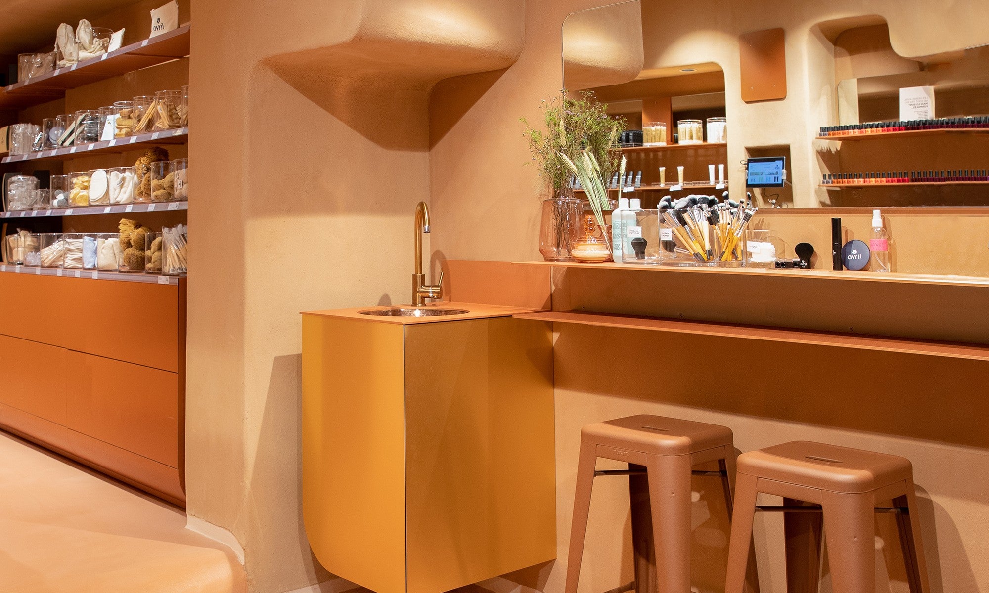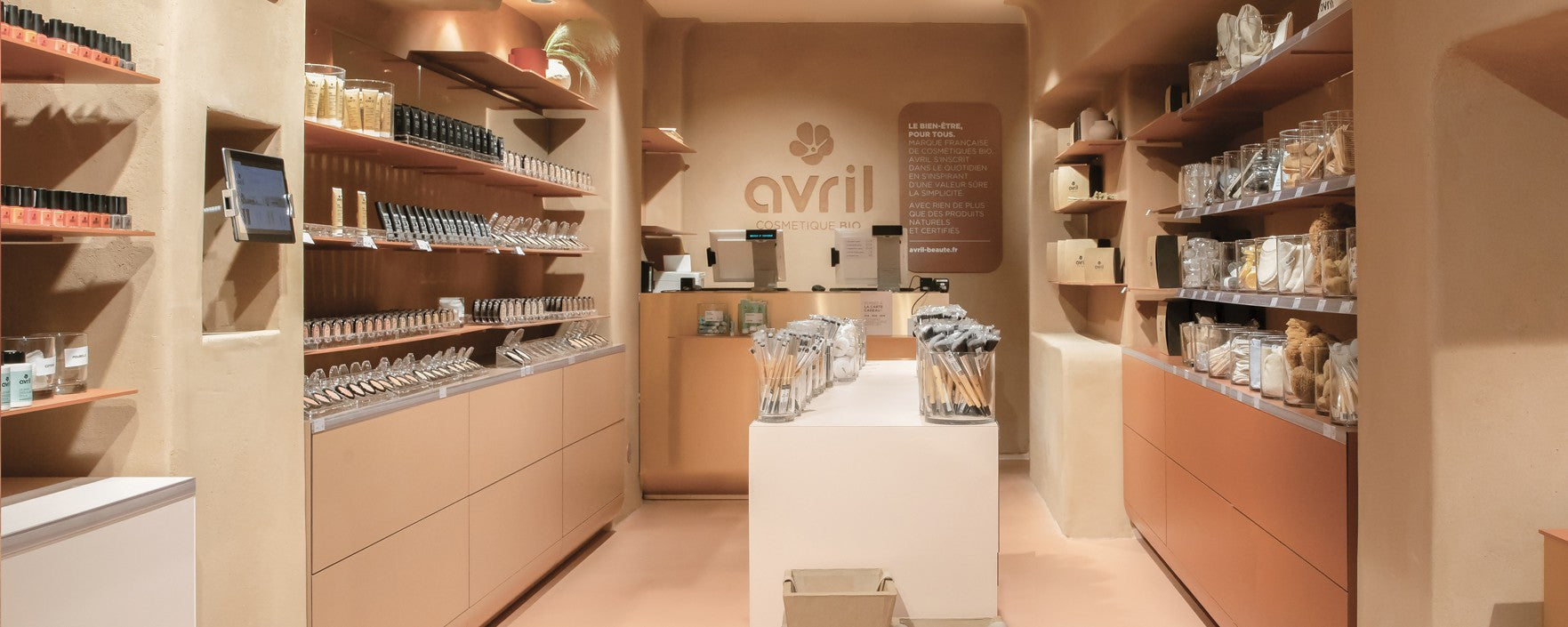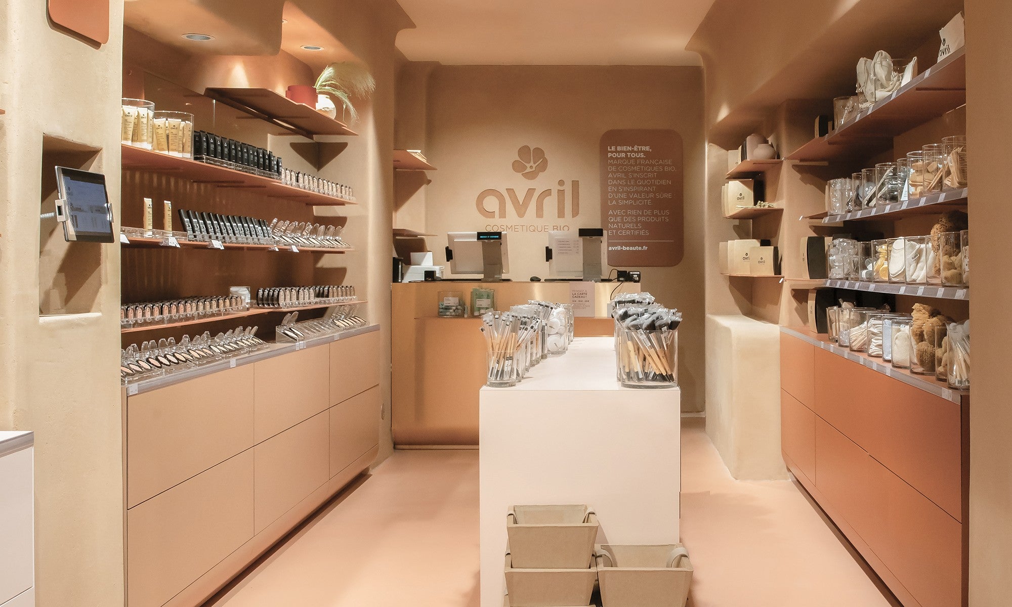 Pour la boutique Avril de la rue Montmartre, au bord des Halles et au pied de Saint-Eustache, Atelier Du Pont a exploré la thématique des matières naturelles et écologiques, et a imaginé un concept basé sur la terre crue de Paris. Le design s’inspire de l’esprit de la marque : matériaux bio sourcés, formes rondes, douces et sensuelles, tons cuivrés à l’image des blush bois de rose, des poudres ambrées, des ombres à paupière nacrées… Les formes organiques, comme des niches sculptées dans l’argile, créent une ambiance naturelle et authentique. La terre crue, parsemée de graines de lin, scintille telle une terracotta irisée. La pierre d’origine apparaît çà et là. Le sol en béton teinté d’ocre s’harmonise avec l’ensemble, jouant du contraste entre tradition et modernité. Les présentoirs, sous forme de fines étagères métalliques incrustées dans l'argile, et les meubles arrondis, déclinés dans une palette rosée, apportent une touche de fraîcheur et d’élégance.