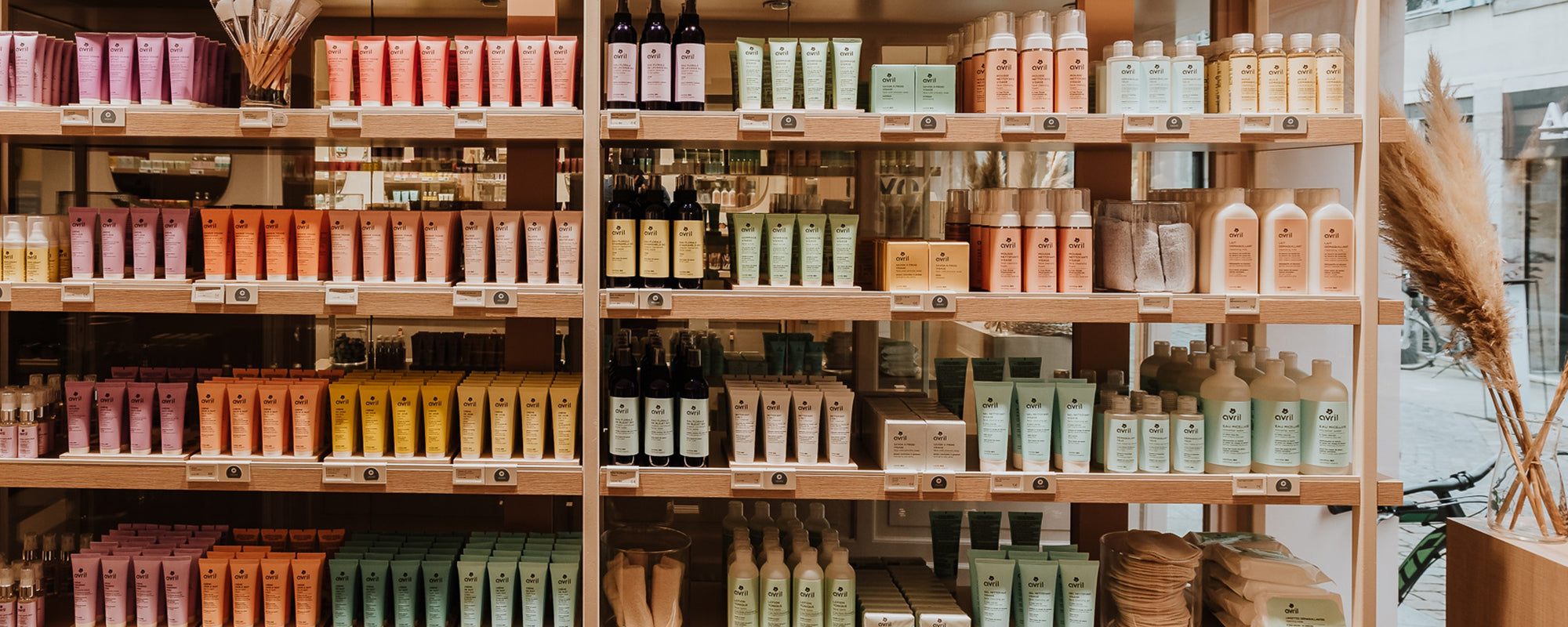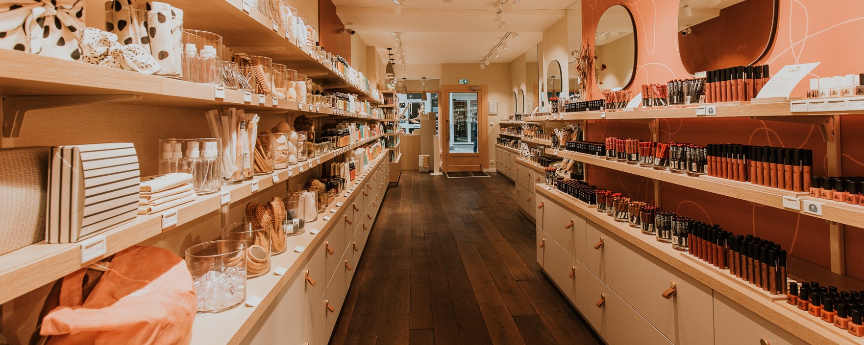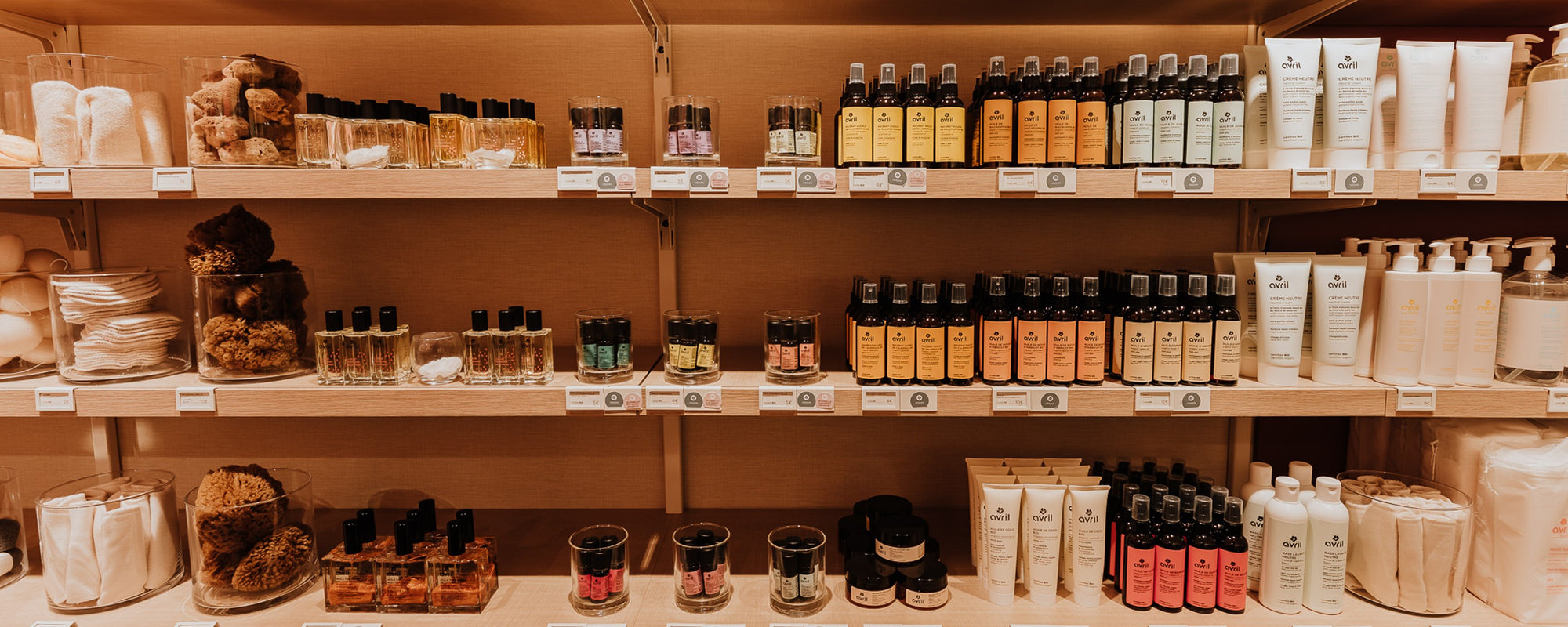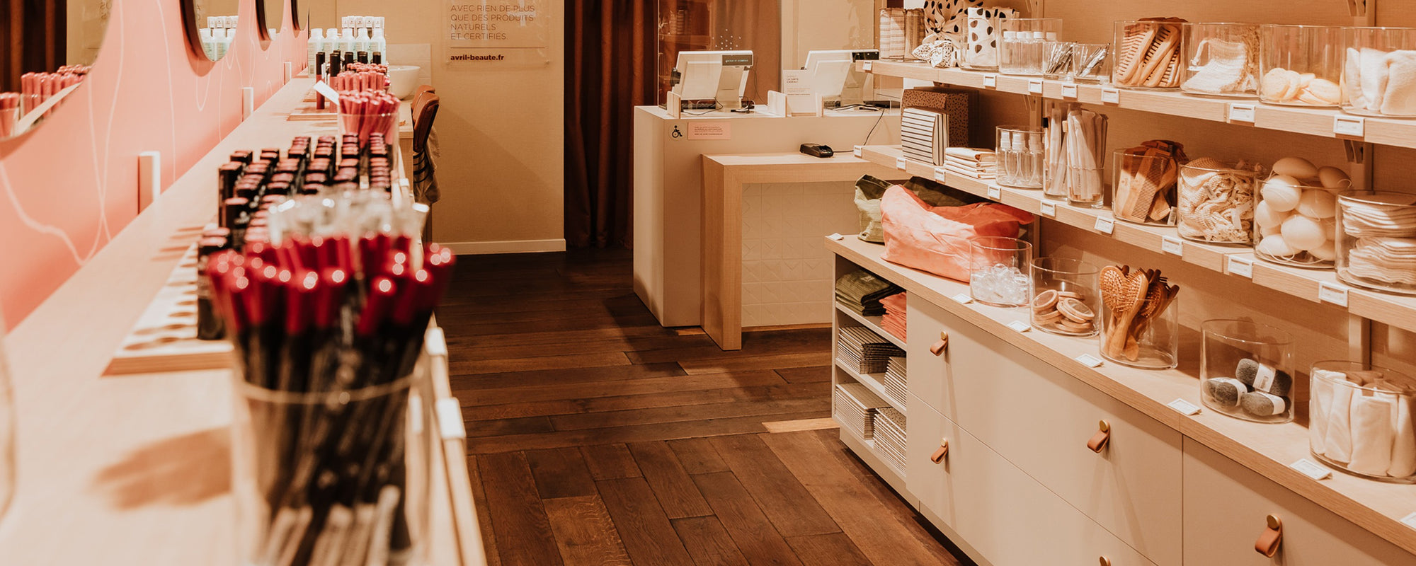 Dans la jolie rue Kéréon, typique du centre historique de Quimper, Avril occupe une charmante boutique toute en longueur. Coté maquillage, des miroirs de forme irrégulière rythment le mur discontinu. Côté soin, tubes colorés et flacons sont sagement alignés. Le plancher d'origine en chêne teinté sombre contraste avec les nuances pastel des produits, et souligne le caractère authentique et ancien du bâtiment.