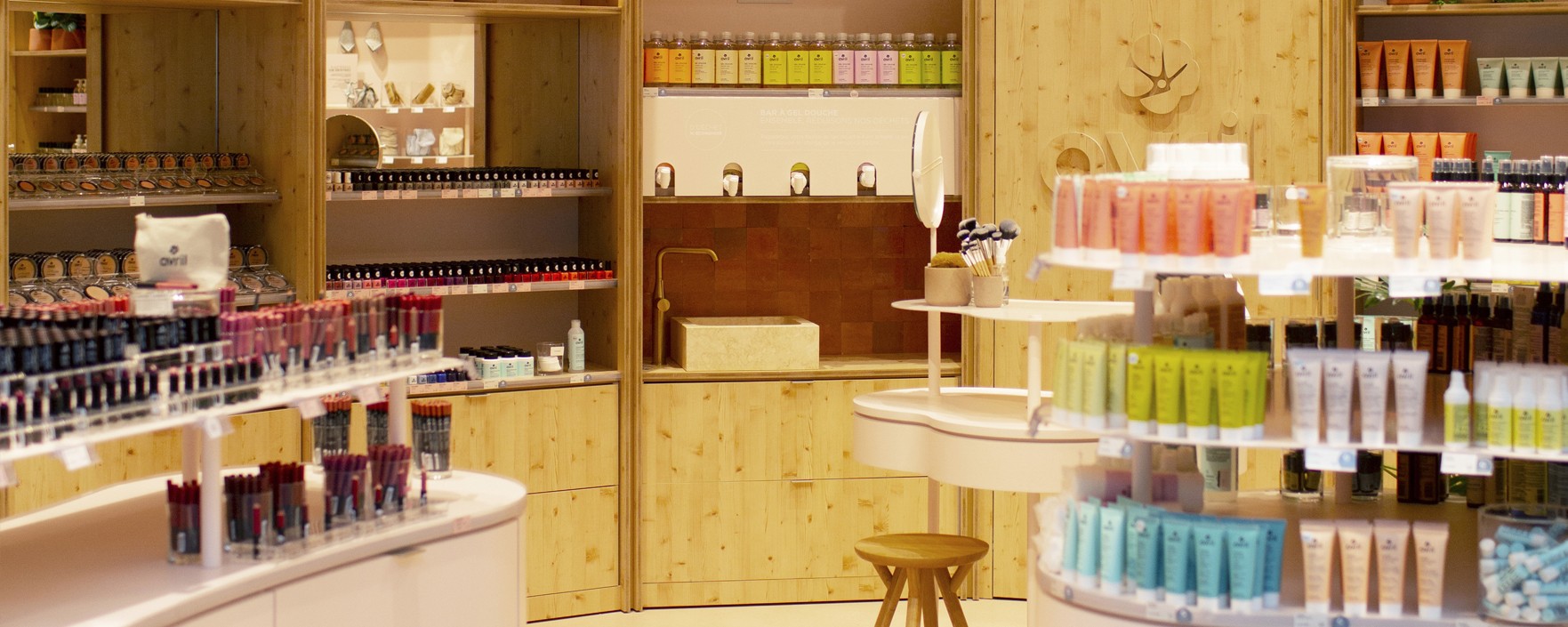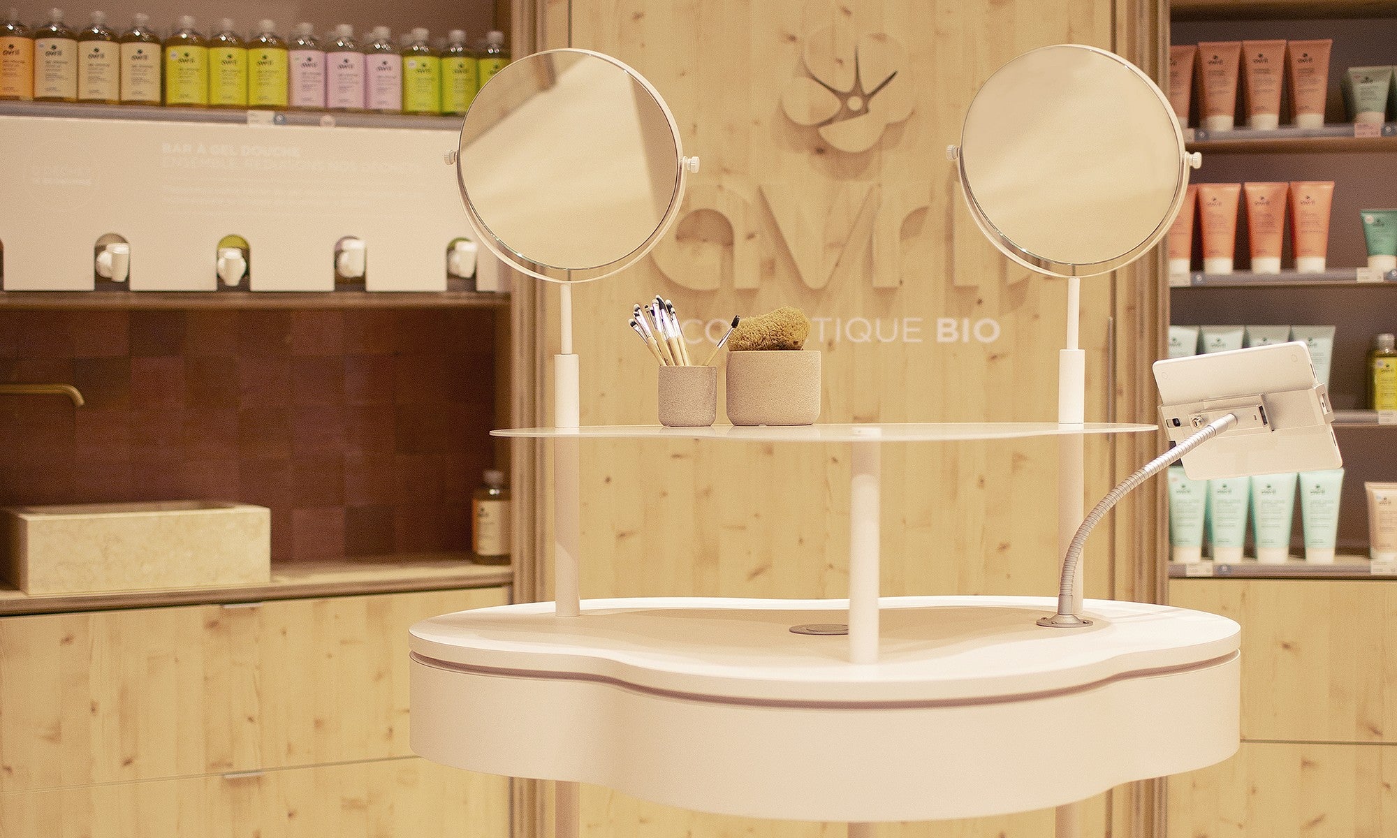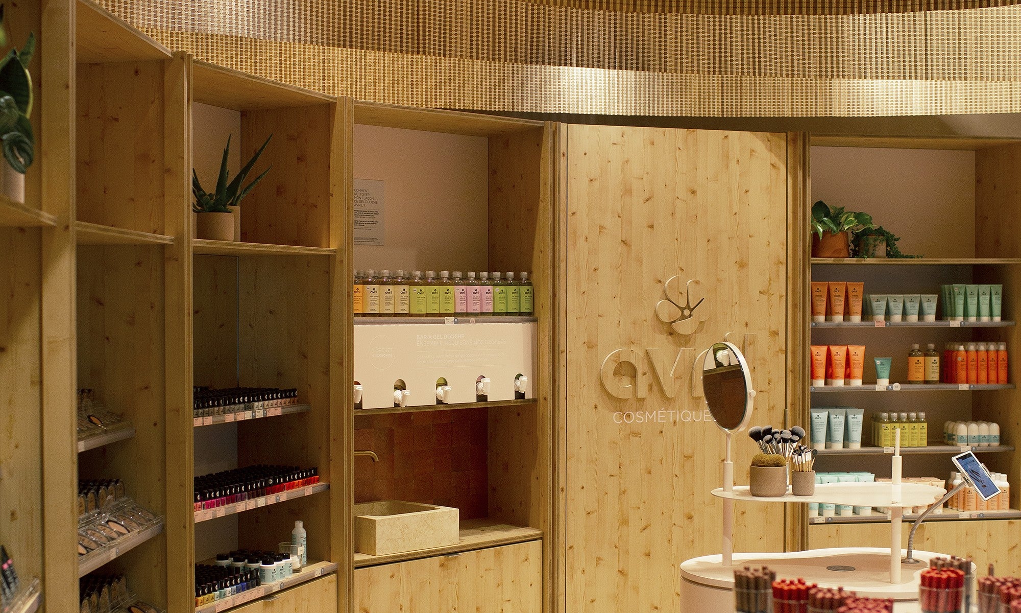 A côté de l’aéroport Charles de Gaulle, la boutique Avril du centre commercial Aéroville conçue par Atelier du Pont s’inspire de l’univers de la marque par l’utilisation de matières naturelles, végétales. Les teintes reprennent la palette colorée et les nuances poudrées des blushs rosés. Pour animer la double hauteur de la boutique, l’agence a imaginé de grandes nattes de bambou tressé suspendues et ondulantes. Le mobilier central aux formes organiques invite à circuler pour découvrir les produits. Un grand linéaire menuisé en bois brut biosourcé reprend la courbe des nattes végétales, et apporte chaleur et sensibilité.
