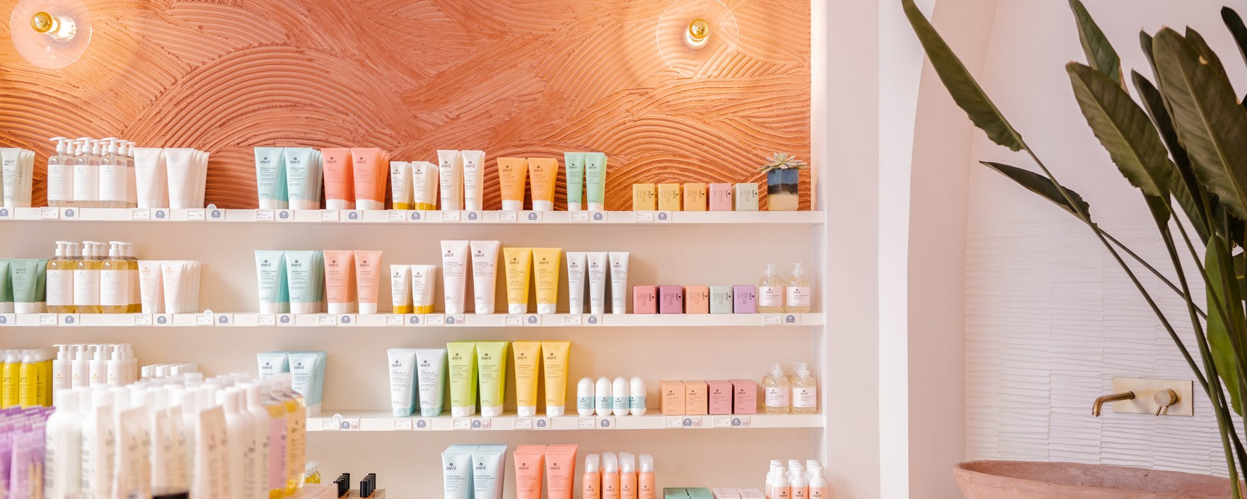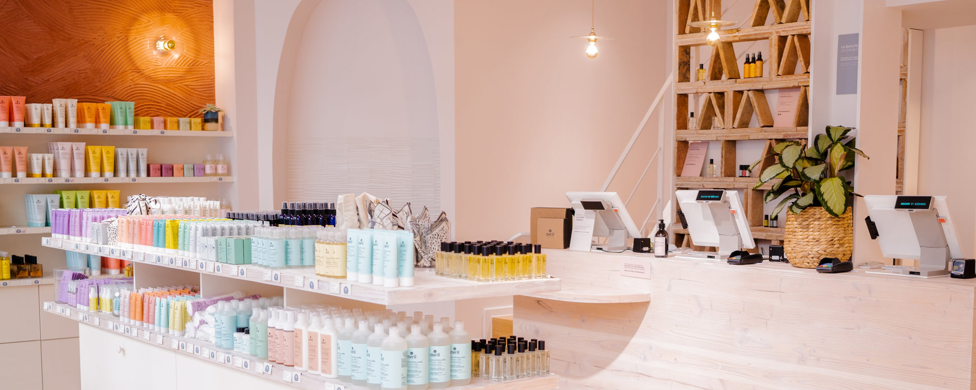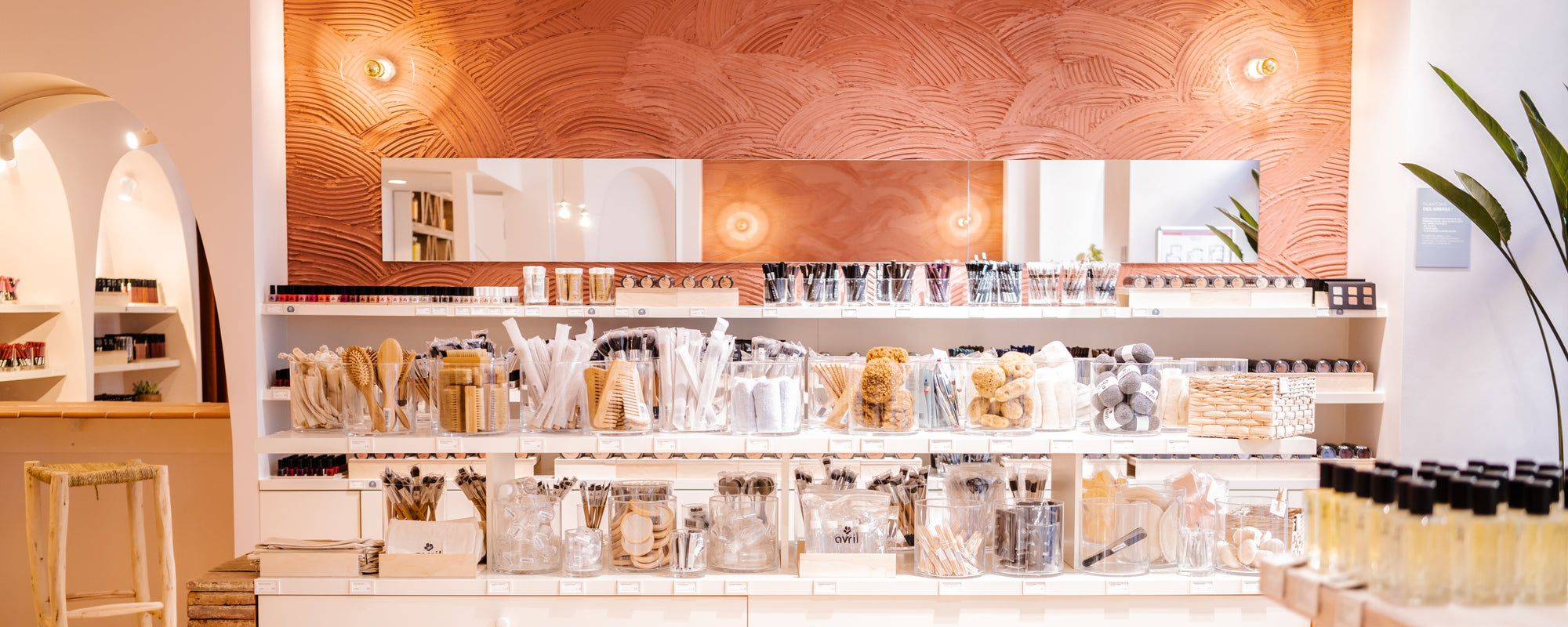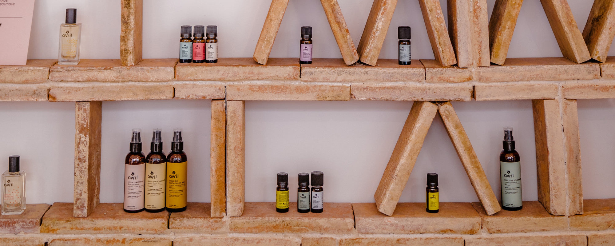 Dans la Ville Rose, l'avenue Alsace-Lorraine aligne ses majestueux immeubles haussmanniens. Dans la boutique Avril, l'architecte toulousaine Cécile Derrien a mis à l'honneur les fameuses briques locales. Issues d'une filière de récupération, des briques anciennes accueillent les visiteurs, habillant chaque côté du meuble qui fait face à l'entrée. Derrière la caisse, par un habile jeu de construction, elles forment une surprenante étagère-bibliothèque. Sur les murs, un crépi ocre nervuré constitué de chaux et de pigments naturels de terre évoque les ondulations de la Garonne. Il contraste avec le mobilier blanc, et crée une harmonie de couleurs avec la vasque en terre cuite, et les appuis de fenêtre qui servent de tablette pour le bar à maquillage niché dans une alcôve parabolique. Des suspensions vintage toutes simples éclairent le bois massif local utilisé pour le comptoir.