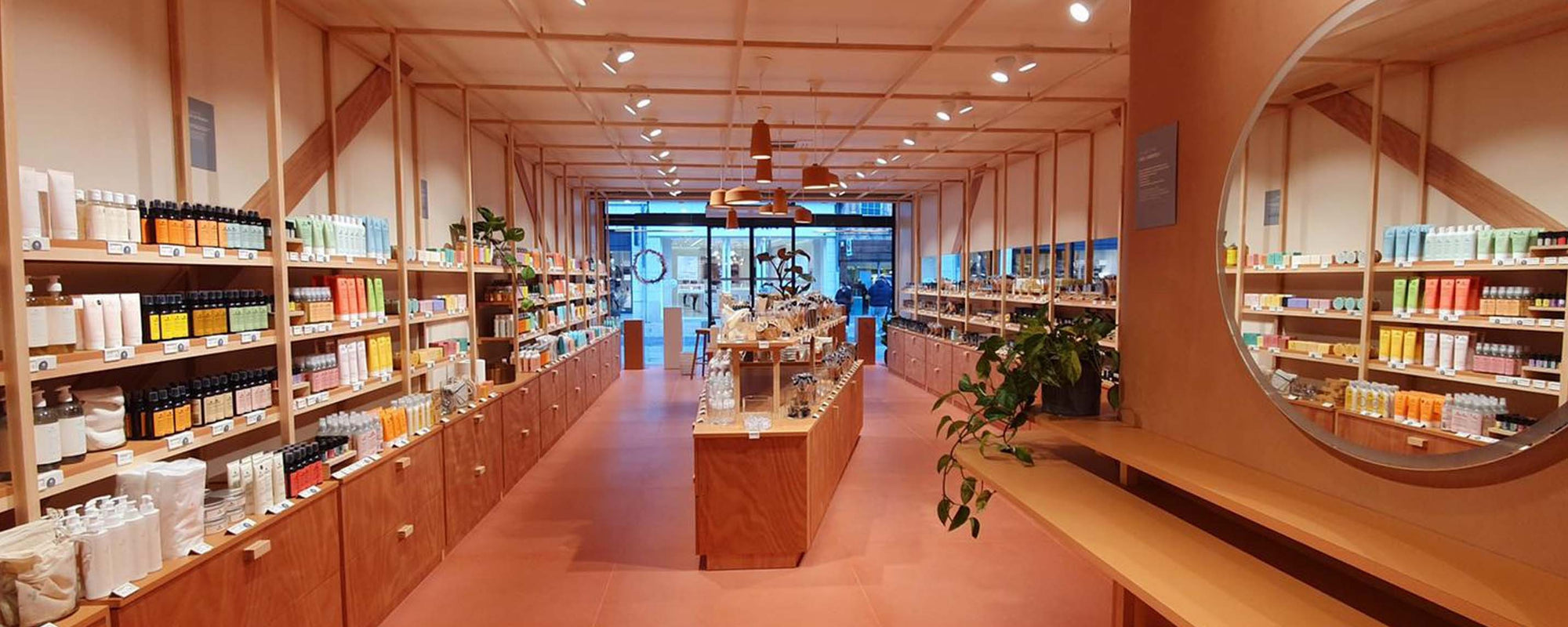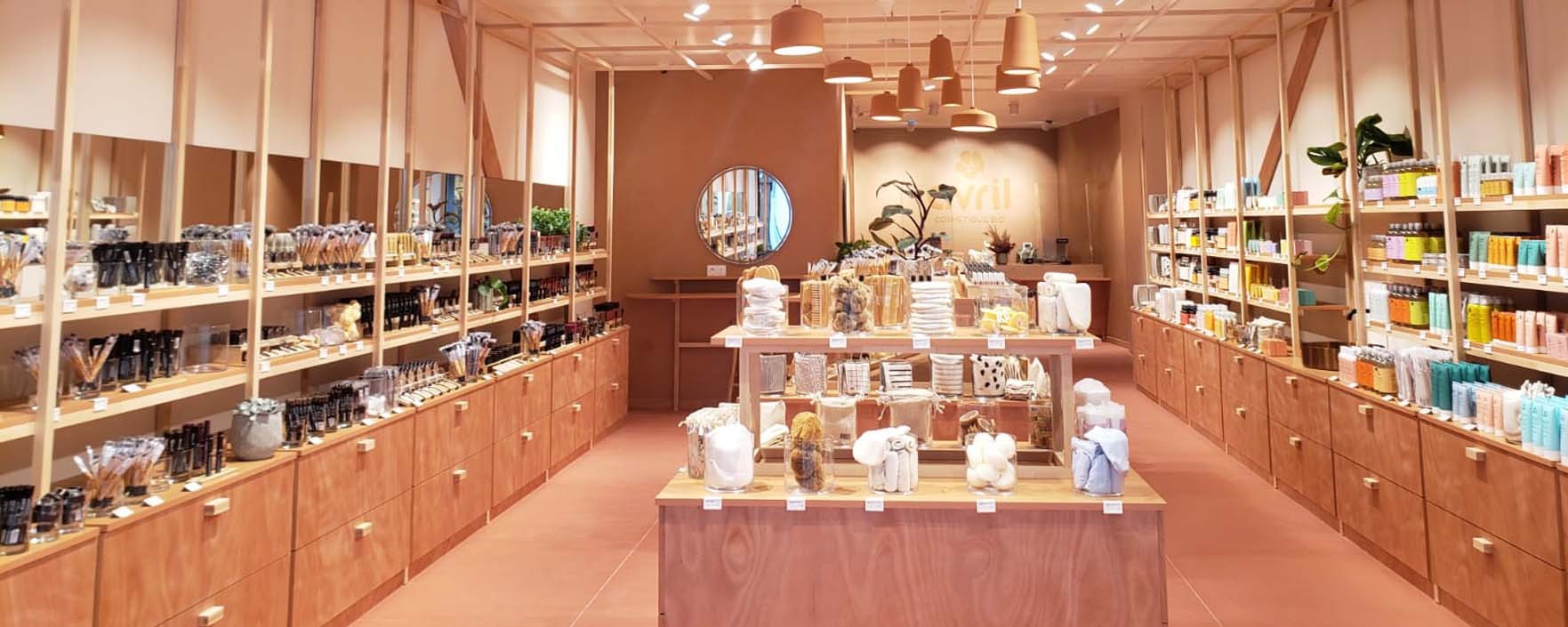 Pour sa première boutique Avril en plein centre de Troyes, l’architecte Laure Desesquelles a imaginé un étonnant jeu de structures en bois qui longent les murs et les plafonds de la boutique, comme un clin d’œil à l’architecture à colombages typique de la ville. Délicates, les teintes poudrées de la boutique sont dynamisées par l’utilisation de deux essences de bois, l’oukoumé au veinage intense, et un bois à la teinte plus claire. La peinture à la chaux sur les murs et le carrelage imitant la terre cuite contribuent à créer un espace à l’ambiance douce et enveloppante.